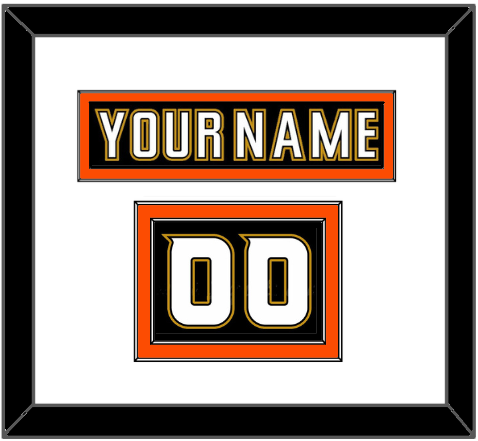 Anaheim Home Black (2006 Through 2014) Jersey Nameplate & Numbers From Shoulder - The Nameplate Is Single Mat Cut:  Black Nameplate Mounted On An Orange Mat.  To Match The Jersey, The Numbers Are Double Mat Cut: White Mat Over An Orange Mat.  White Numbers Mounted On A Black Mat.  Black Frame.