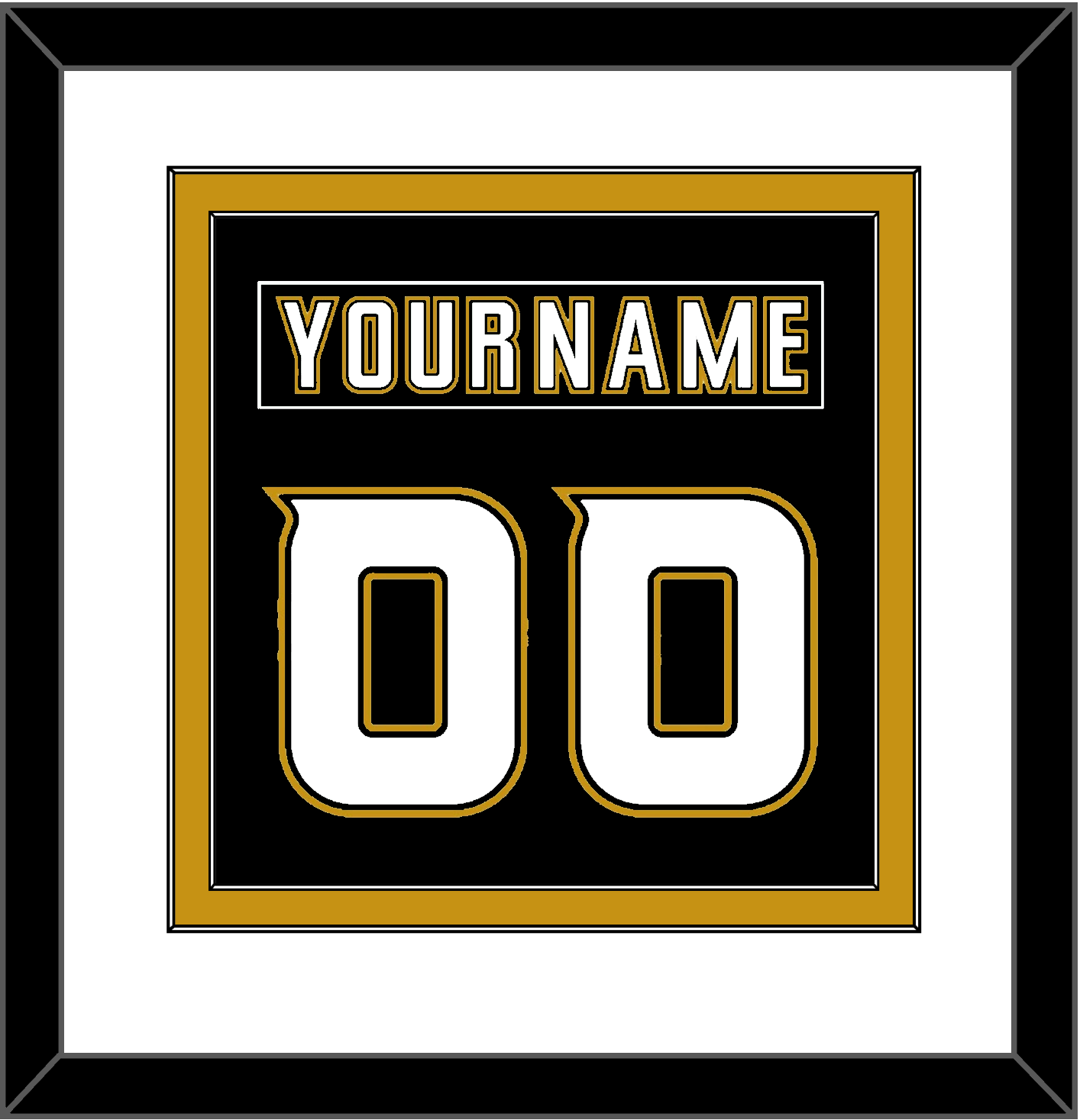 Anaheim Home Black Jersey (2006 Through 2014) Nameplate & Number (From The Back Of The Jersey). Double Mat Cut: White Mat Over A Gold Mat. Black Nameplate And White Number Mounted On A Black Mat. Black Frame.