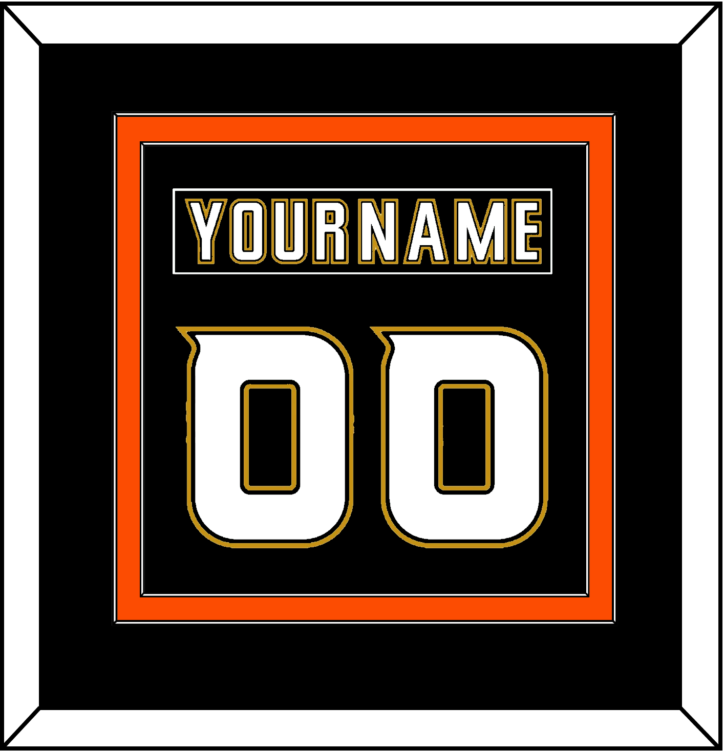 Anaheim Home Black Jersey (2006 Through 2014) Nameplate & Number (From The Back Of The Jersey). Double Mat Cut: Black Mat Over An Orange Mat. Black Nameplate And White Number Mounted On A Black Mat. White Frame.