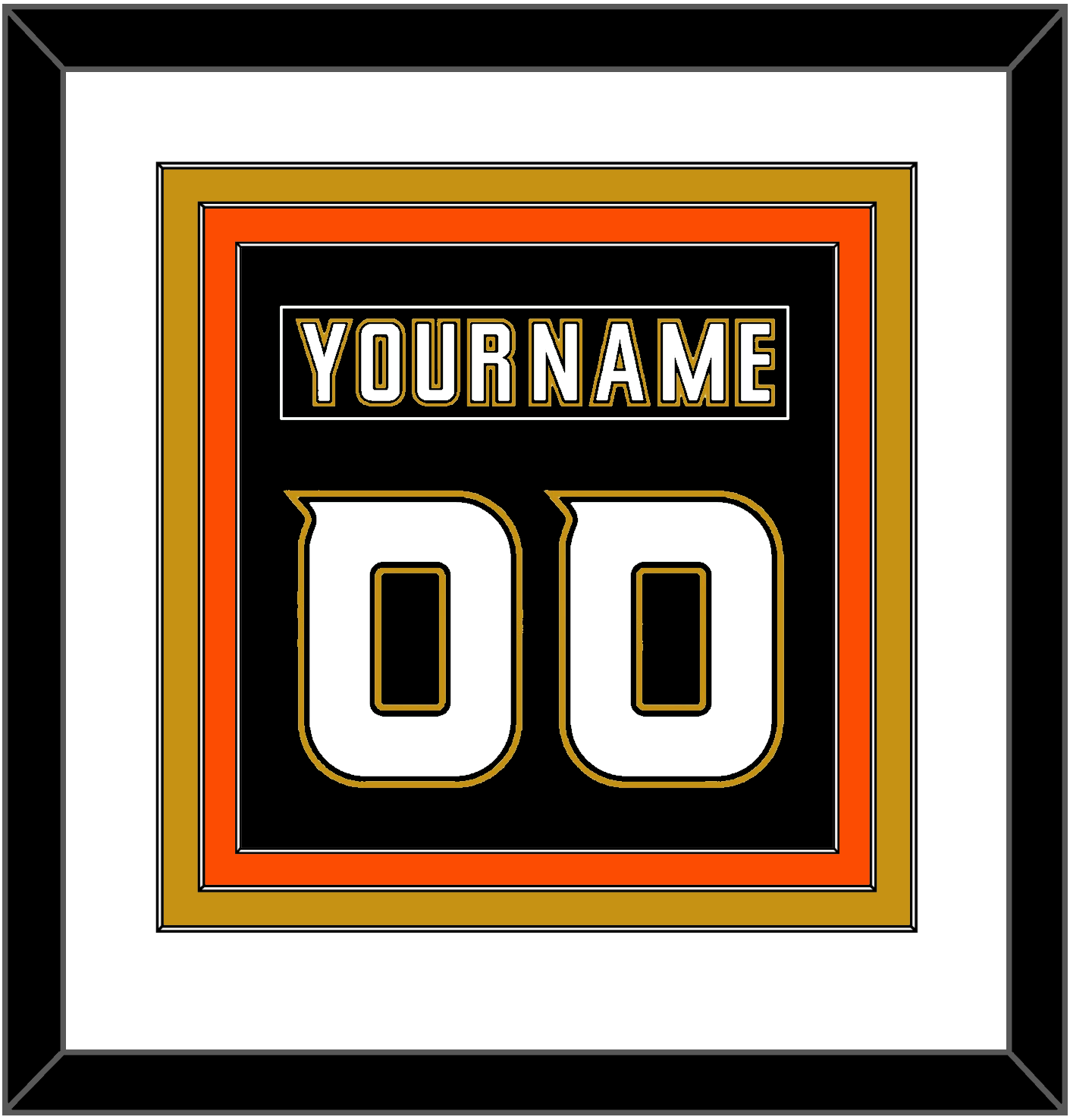 Anaheim Home Black Jersey (2006 Through 2014) Nameplate & Number (From The Back Of The Jersey). Triple Mat Cut: White Mat Over A Gold Mat Over An Orange Mat. Black Nameplate And White Number Mounted On A Black Mat. Black Frame.