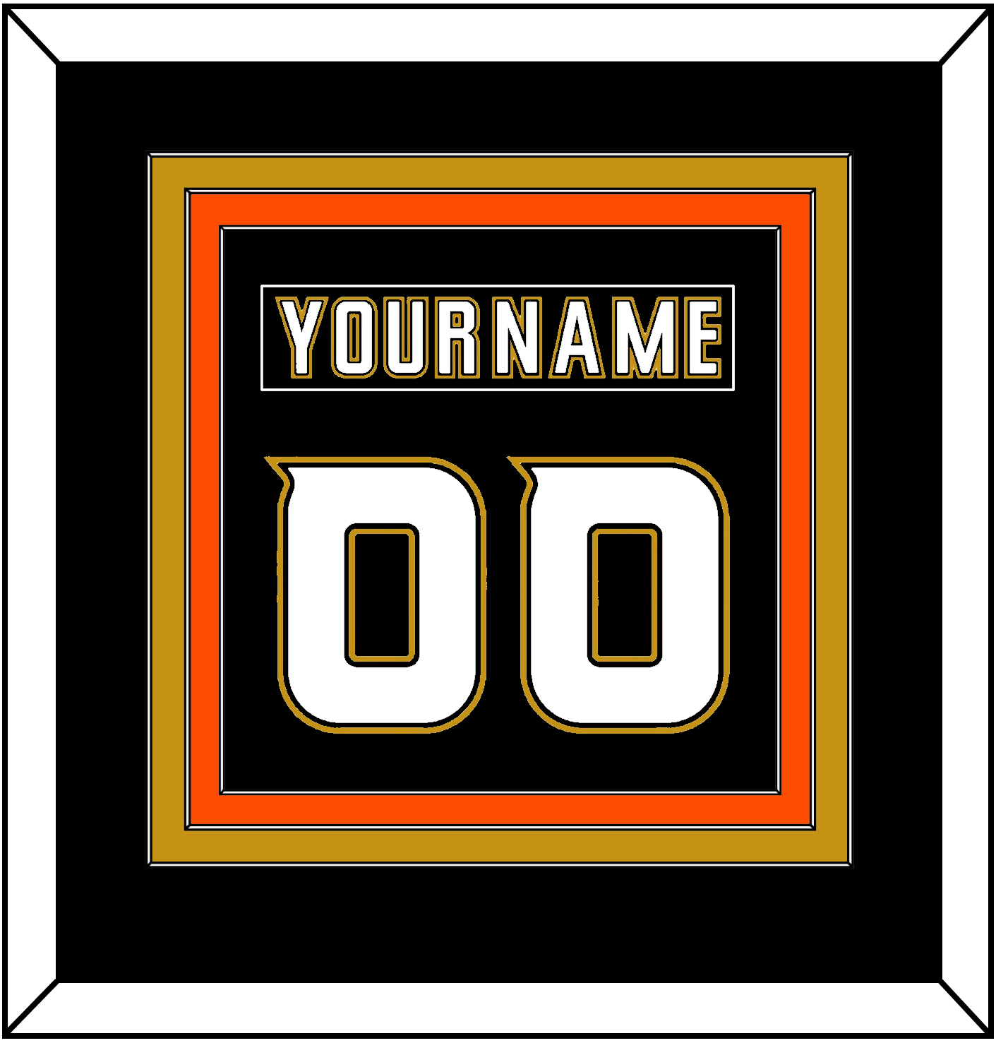 Anaheim Home Black Jersey (2006 Through 2014) Nameplate & Number (From The Back Of The Jersey). Triple Mat Cut: Black Mat Over A Gold Mat Over An Orange Mat. Black Nameplate And White Number Mounted On A Black Mat. White Frame.