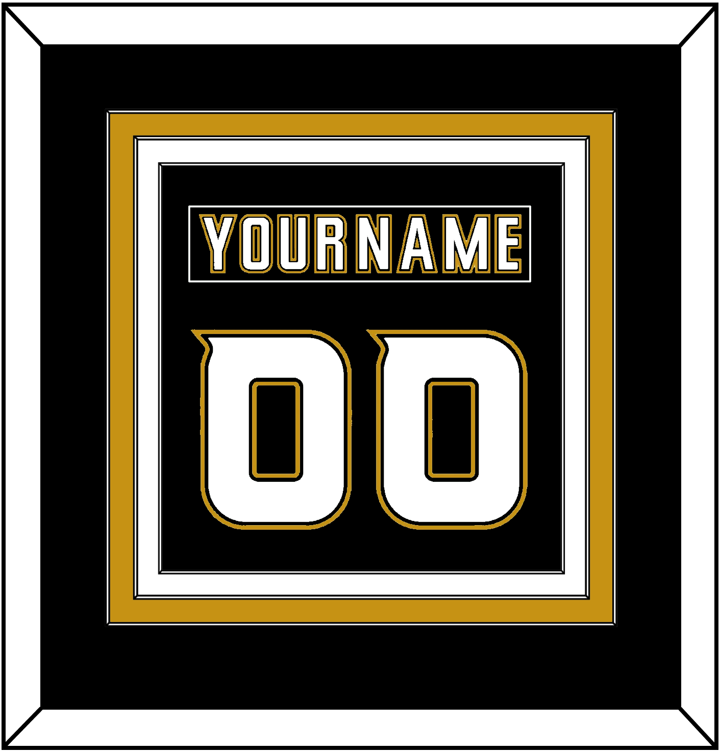 Anaheim Home Black Jersey (2006 Through 2014) Nameplate & Number (From The Back Of The Jersey). Triple Mat Cut: Black Mat Over A Gold Mat Over A White Mat. Black Nameplate And White Number Mounted On A Black Mat. White Frame.