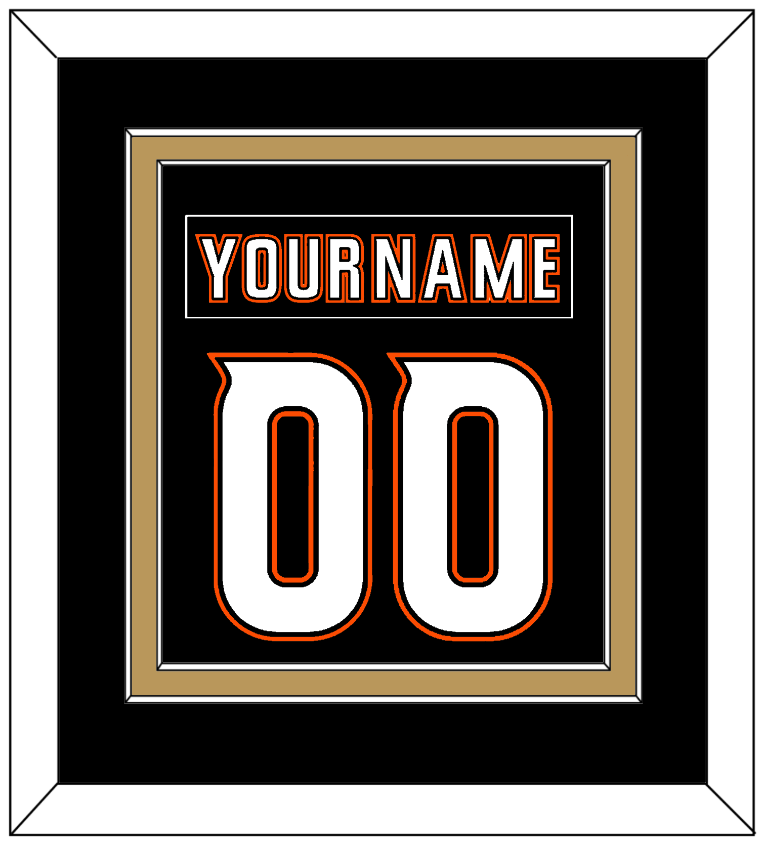 Anaheim Home Black Jersey (2014 Through 2024) Nameplate & Number (From The Back Of The Jersey). Double Mat Cut: Black Mat Over A Gold Mat. Black Nameplate And White Number Mounted On A Black Mat. White Frame.
