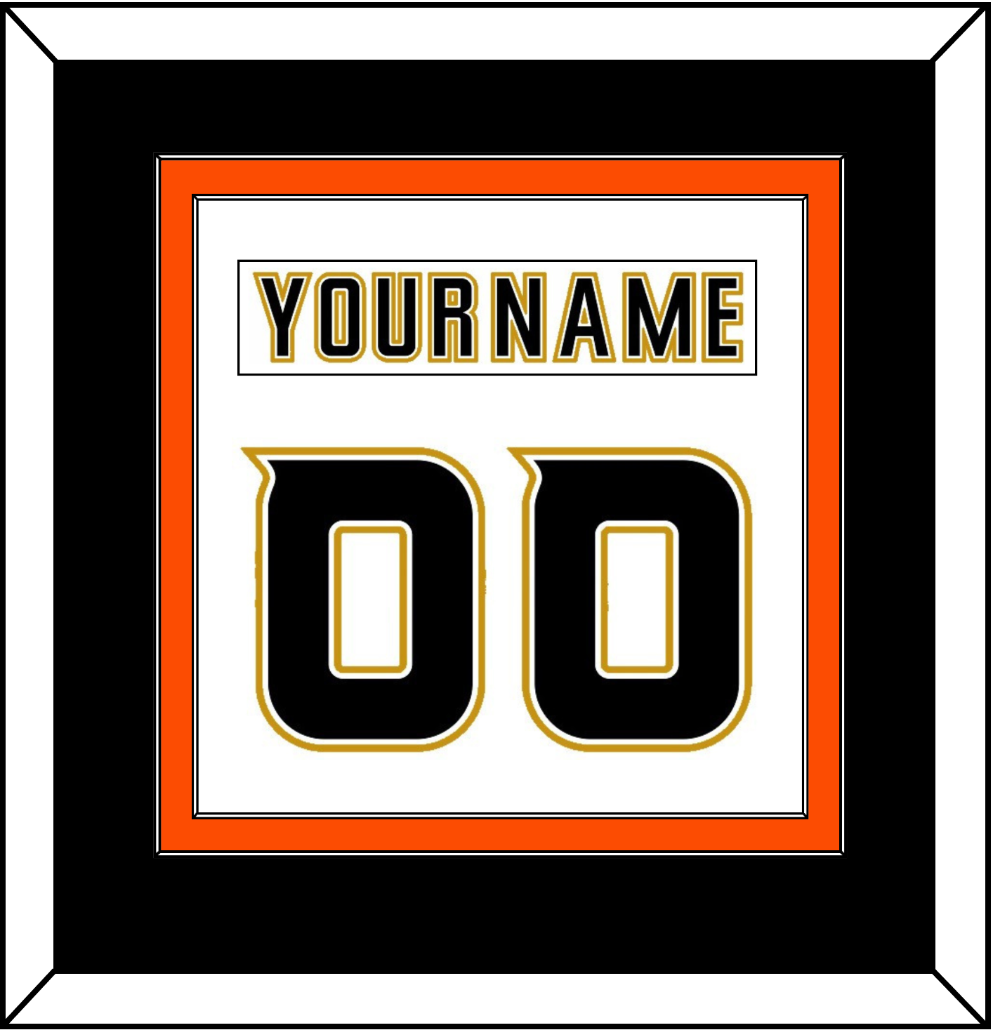 Anaheim Road White Jersey (2006 Through 2014) Nameplate & Number (From The Back Of The Jersey). Double Mat Cut: Black Mat Over An Orange Mat. White Nameplate And Black Number Mounted On A White Mat. White Frame.