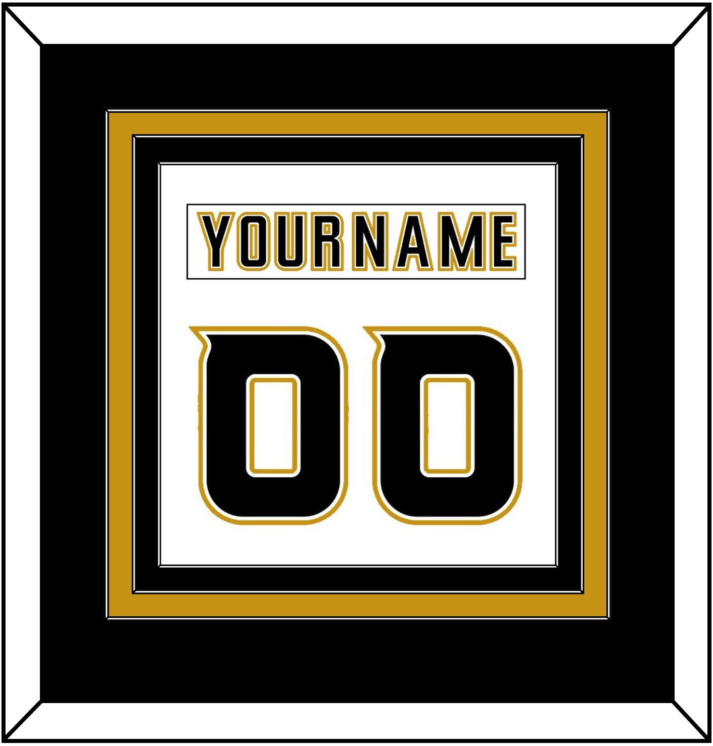 Anaheim Road White Jersey (2006 Through 2014) Nameplate & Number (From The Back Of The Jersey).  Triple Mat Cut:  Black Mat Over A Gold Mat Over A Black Mat.  White Nameplate And Black Number Mounted On A White Mat.  White Frame.
