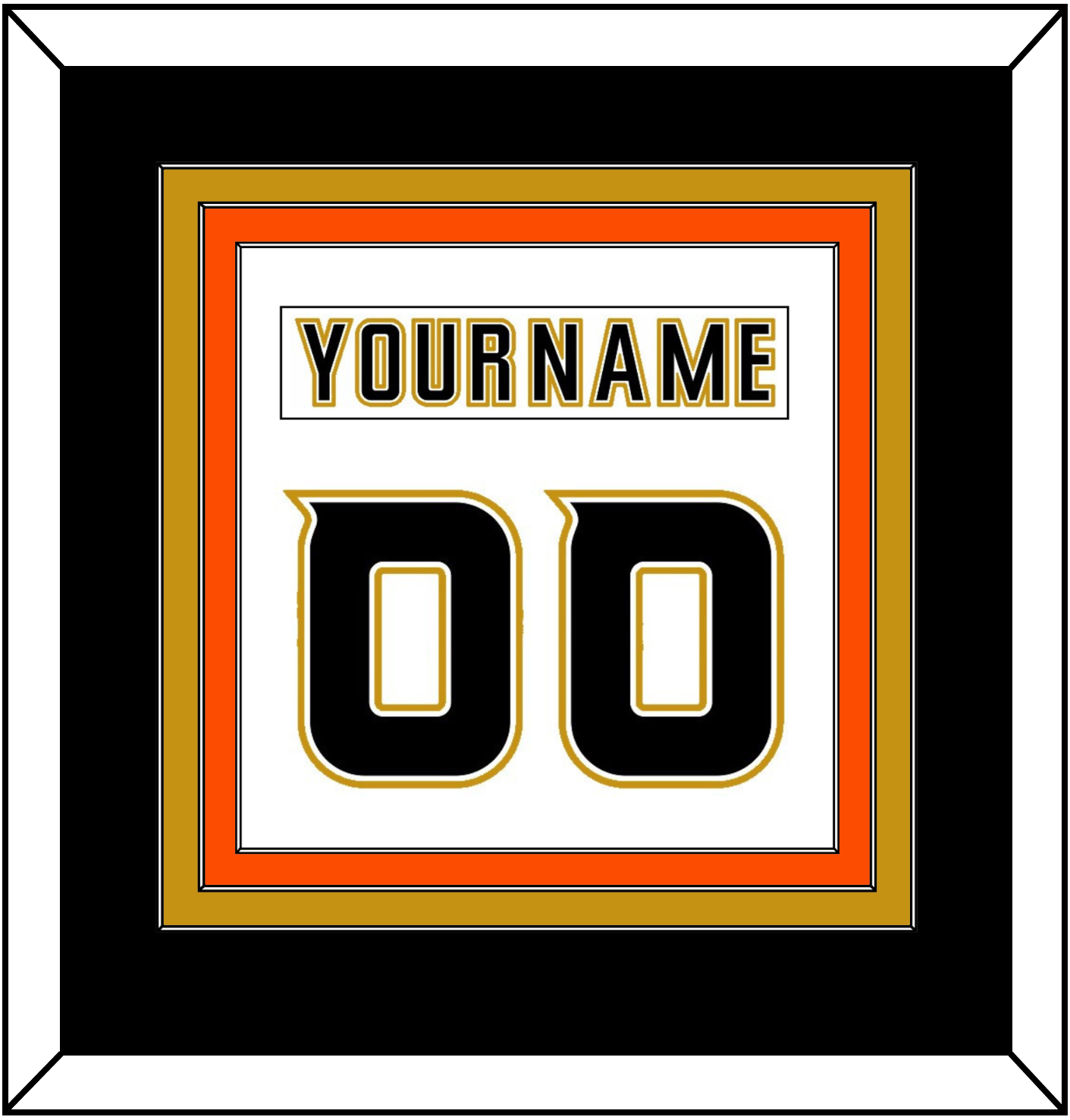 Anaheim Road White Jersey (2006 Through 2014) Nameplate & Number (From The Back Of The Jersey). Triple Mat Cut: Black Mat Over A Gold Mat Over An Orange Mat. White Nameplate And Black Number Mounted On A White Mat. White Frame.