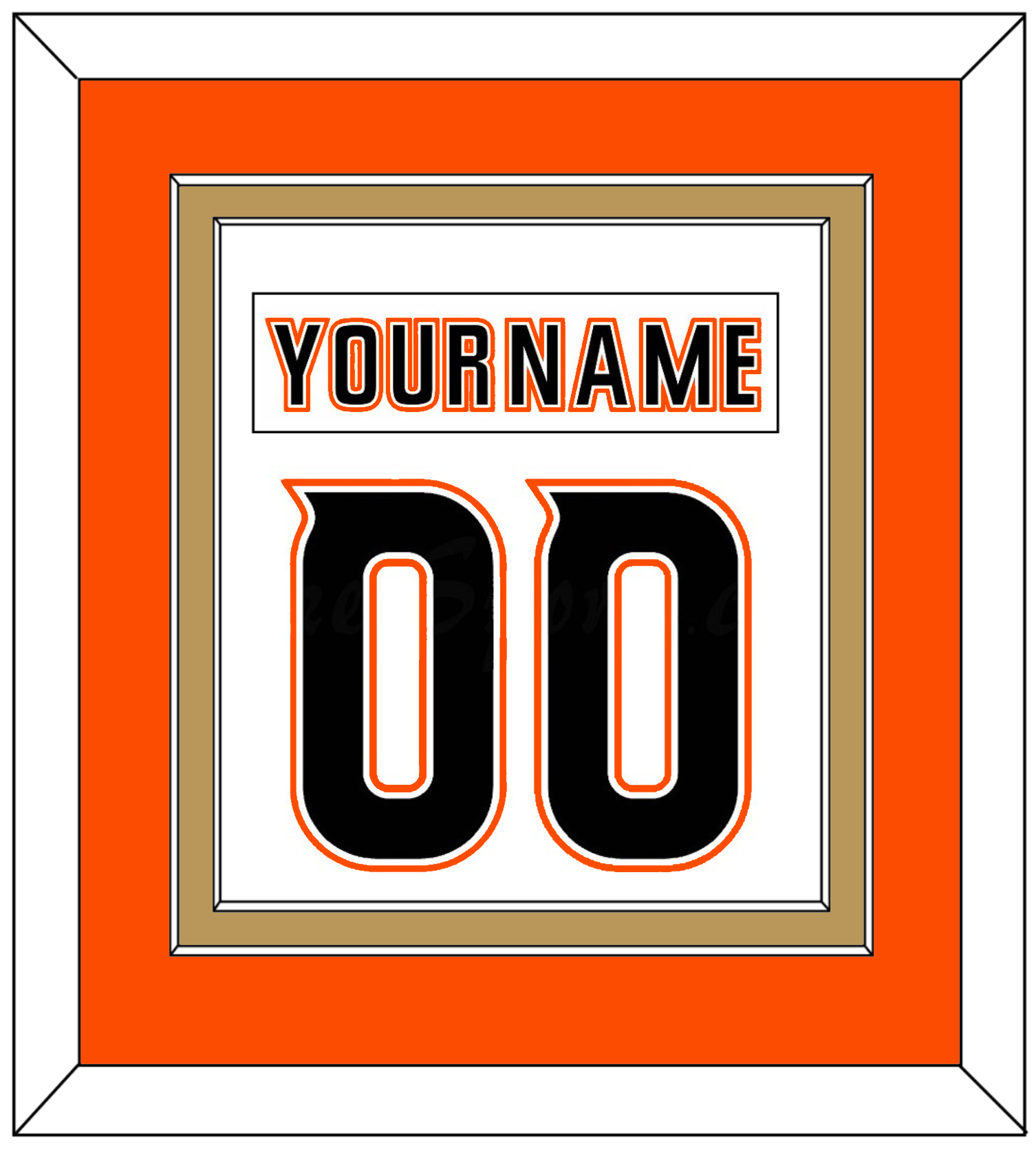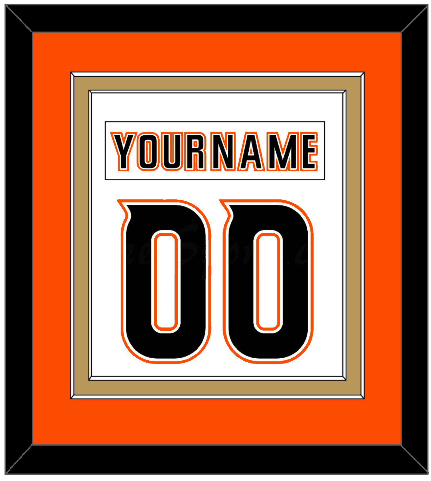 Anaheim Road White Jersey (2014 Through 2024) Nameplate & Number (From The Back Of The Jersey).  Double Mat Cut:  Orange Mat Over A Gold Mat.  White Nameplate And Black Number Mounted On A White Mat.  Black Or White Frame.