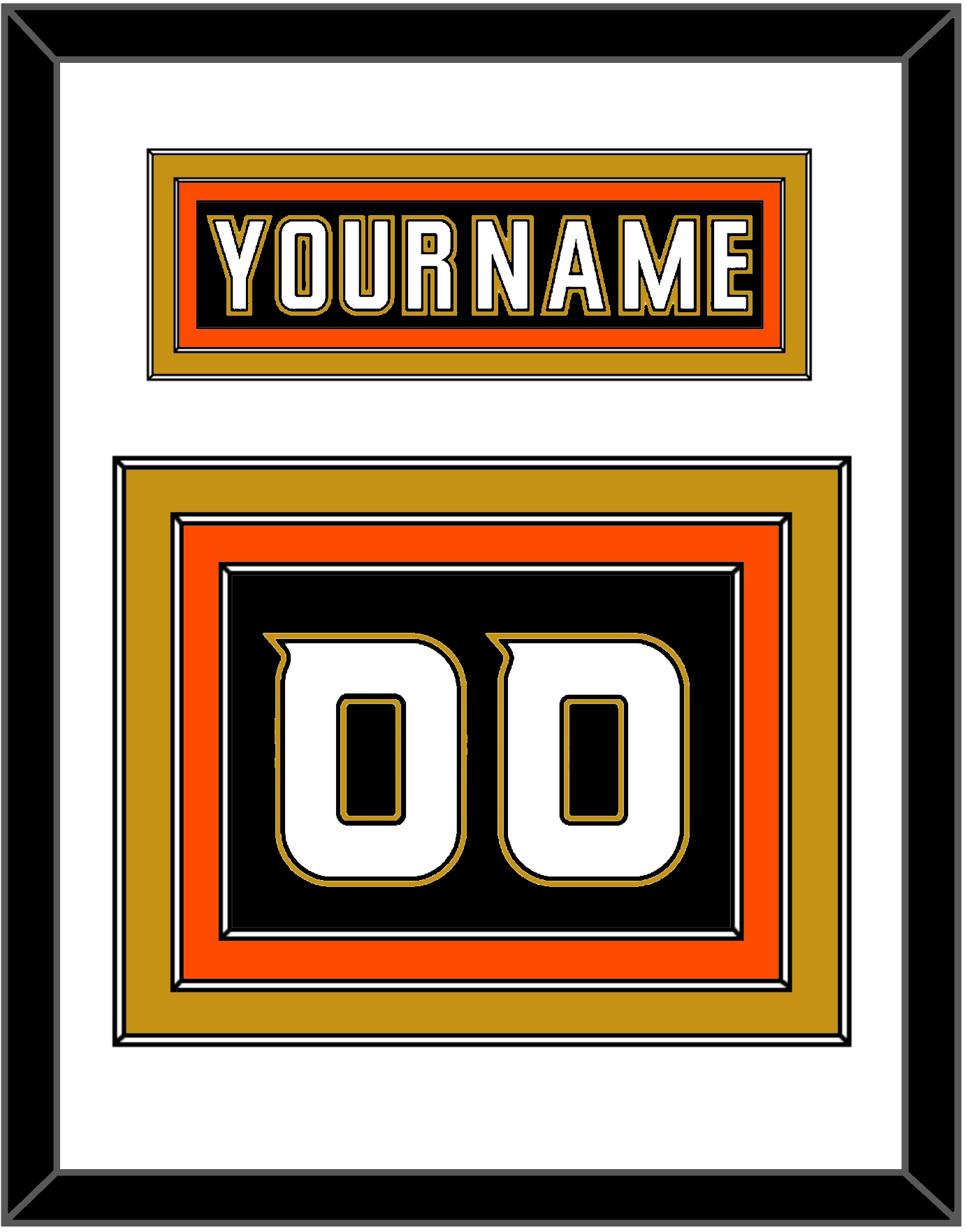 Anaheim Home Black Jersey (2006 Through 2014) Nameplate & Numbers (From The Back Of The Jersey). Nameplate Is Double Mat Cut: White Mat Over A Gold Mat. Black Nameplate Mounted On An Orange Mat. To Match The Jersey, Number Is Triple Mat Cut: White Mat Over A Gold Mat Over An Orange Mat, White Number Mounted On A Black Mat. Black Frame.