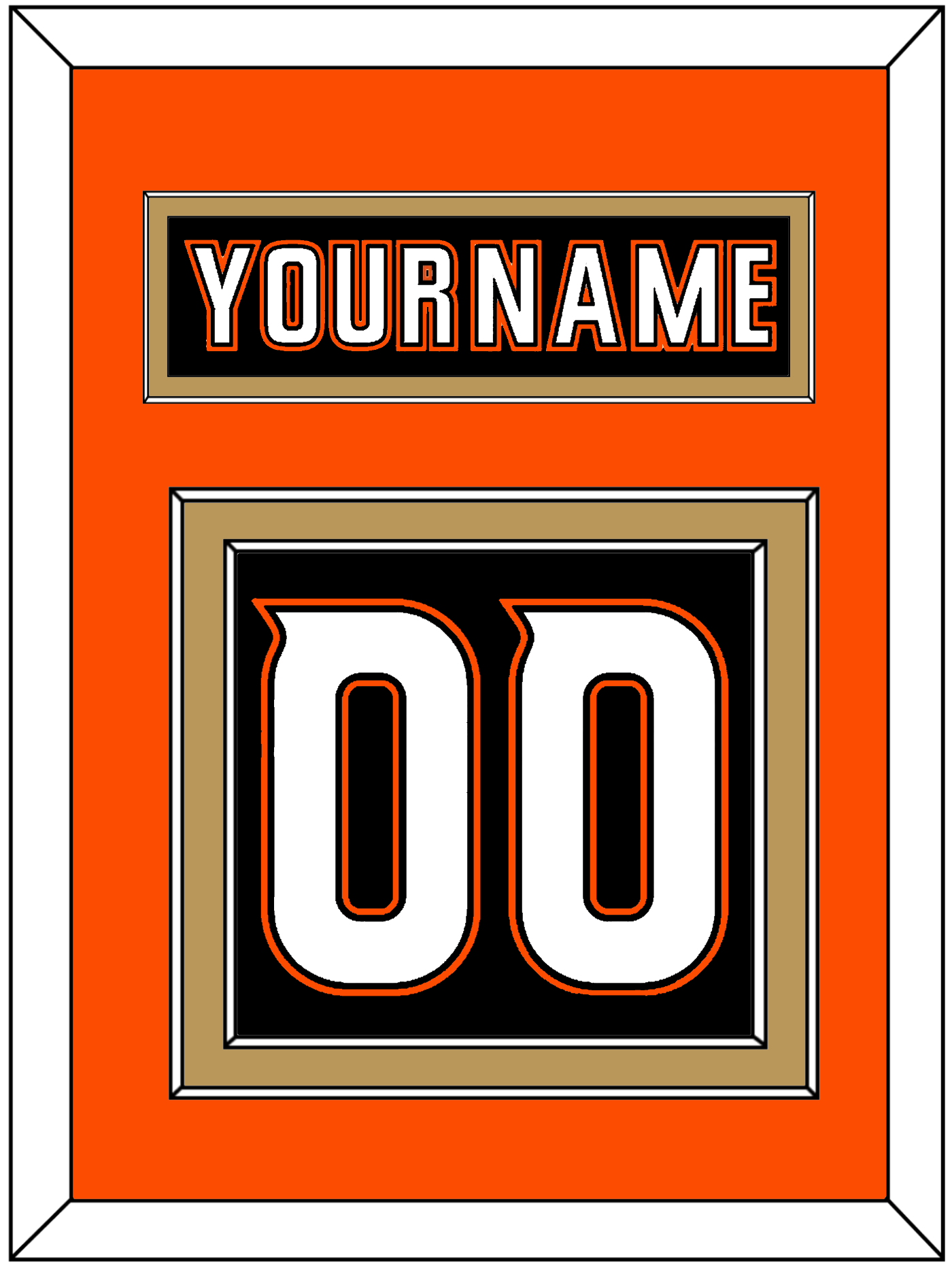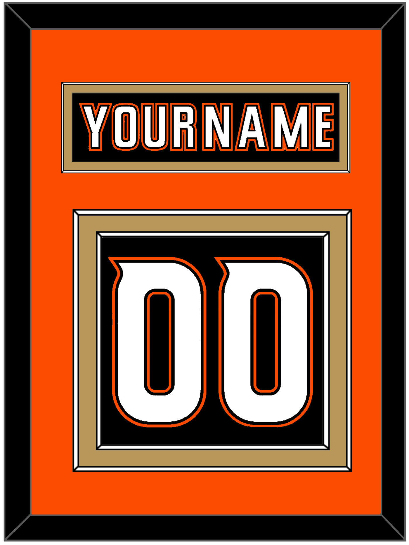 Anaheim Home Black Jersey (2014 Through 2024) Nameplate & Numbers (From The Back Of The Jersey). Nameplate Is Single Mat Cut: Orange Mat With Black Nameplate Mounted On A Gold Mat. To Match The Jersey, Number Is Double Mat Cut: Orange Mat Over A Gold Mat, White Number Mounted On A Black Mat. Black Or White Frame.