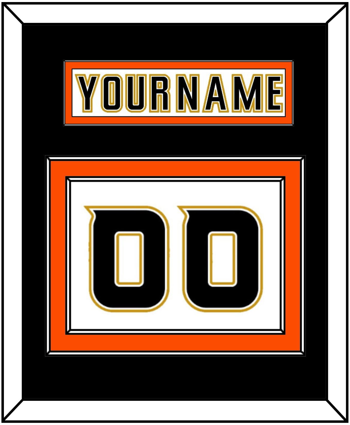 Anaheim Road White Jersey (2006 Through 2014) Nameplate & Numbers (From The Back Of The Jersey). Nameplate Is Single Mat Cut: Black Mat With White Nameplate Mounted On An Orange Mat. To Match The Jersey, Number Is Double Mat Cut: Black Mat Over An Orange Mat, Black Number Mounted On A White Mat. White Frame.