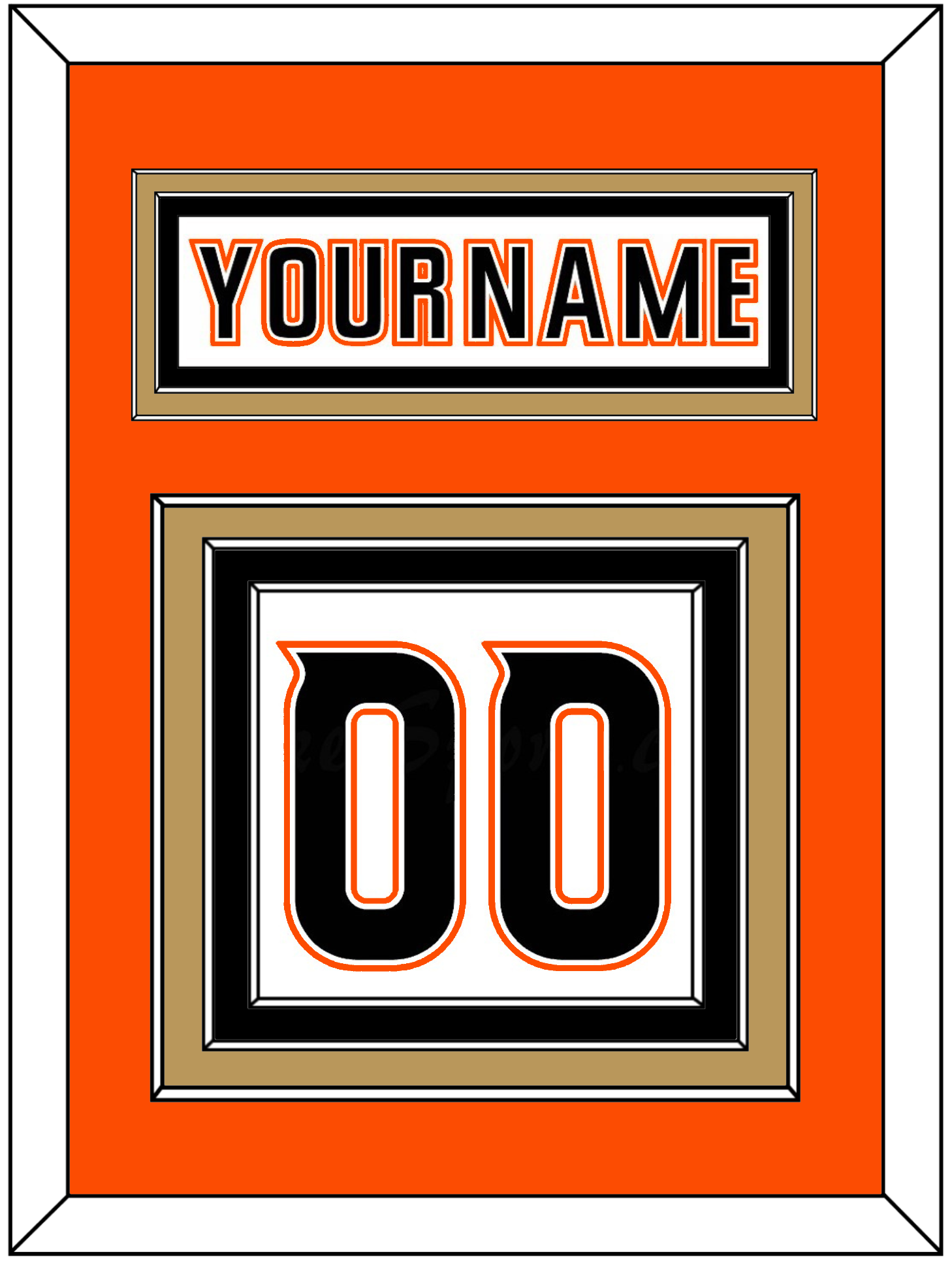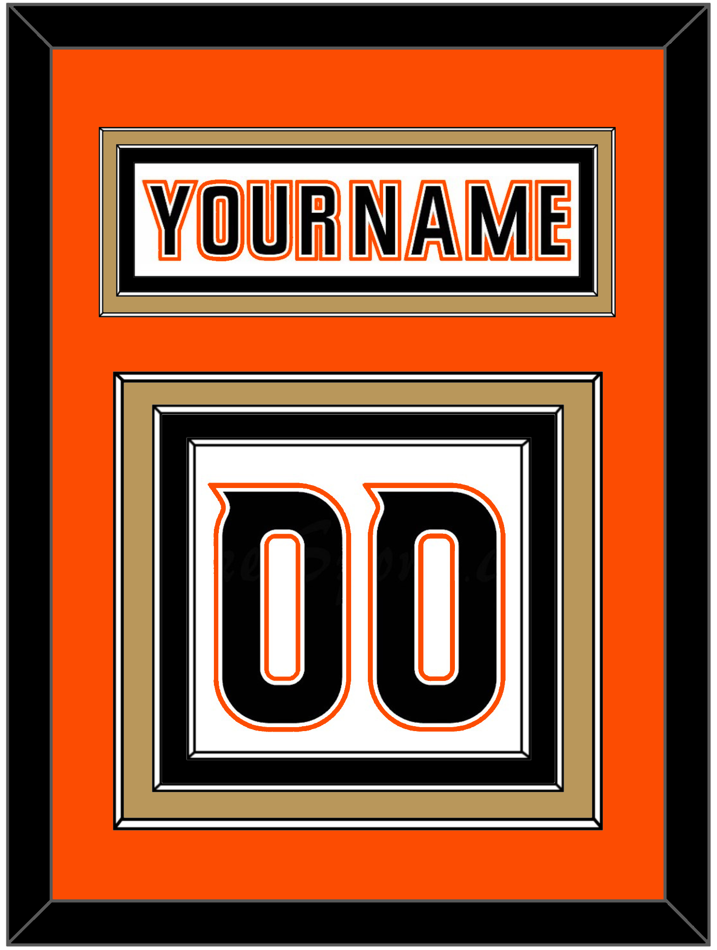 Anaheim Road White Jersey (2014 Through 2024) Nameplate & Numbers (From The Back Of The Jersey). Nameplate Is Double Mat Cut: Orange Mat Over A Gold Mat. White Nameplate Mounted On A Black Mat. To Match The Jersey, Number Is Triple Mat Cut: Orange Mat Over A Gold Mat Over A Black Mat. Black Number Mounted On A White Mat. Black Or White Frame.