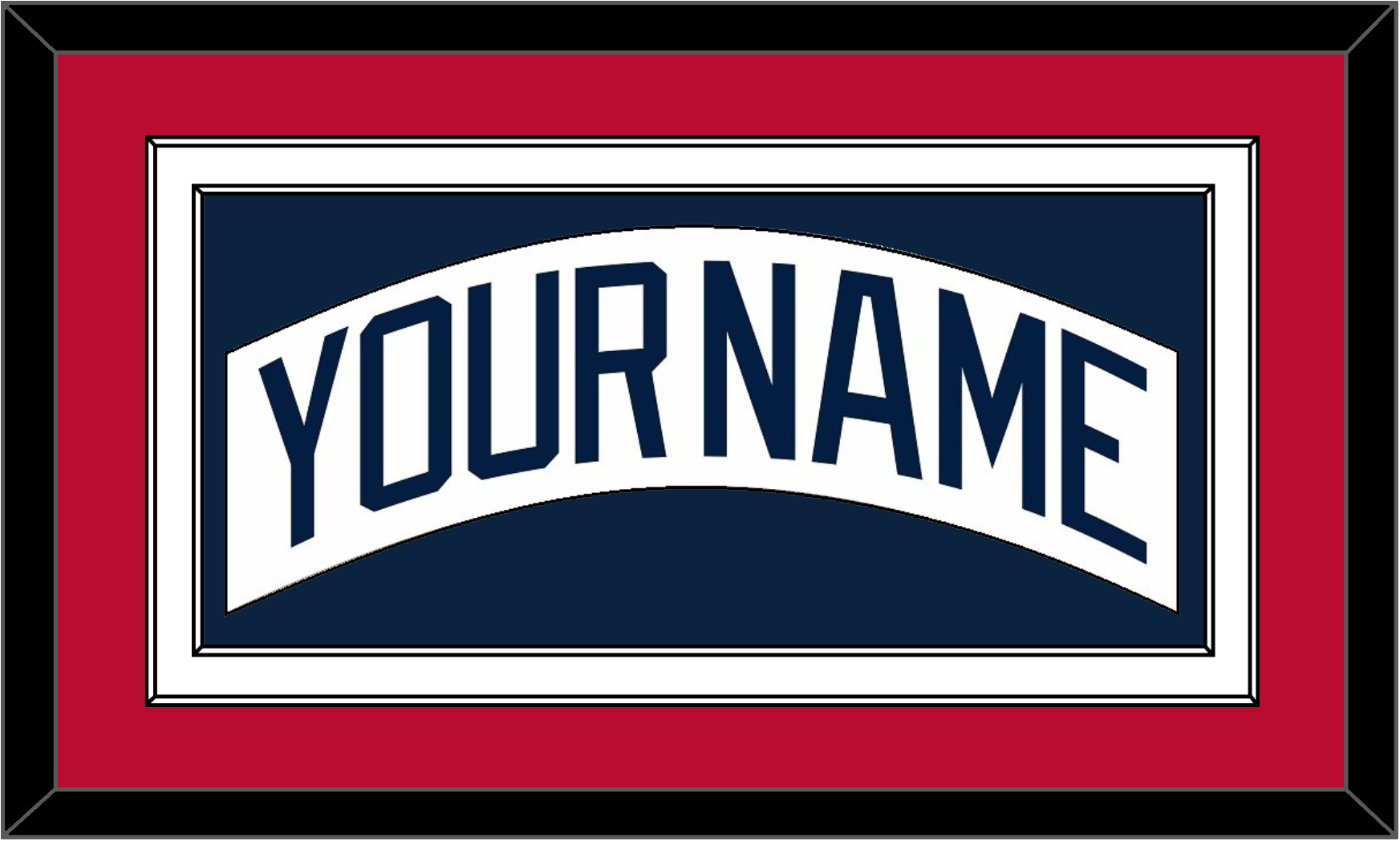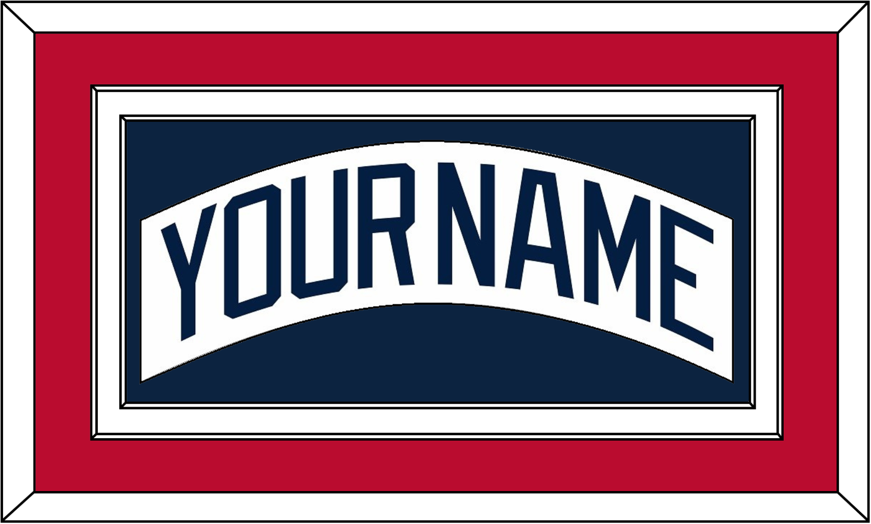Atlanta Home White Jersey Nameplate (1987 Through 2004).  Double Mat:  Red Mat Over A White Mat.  White Nameplate Mounted On A Blue Mat.  White Or Black Frame.