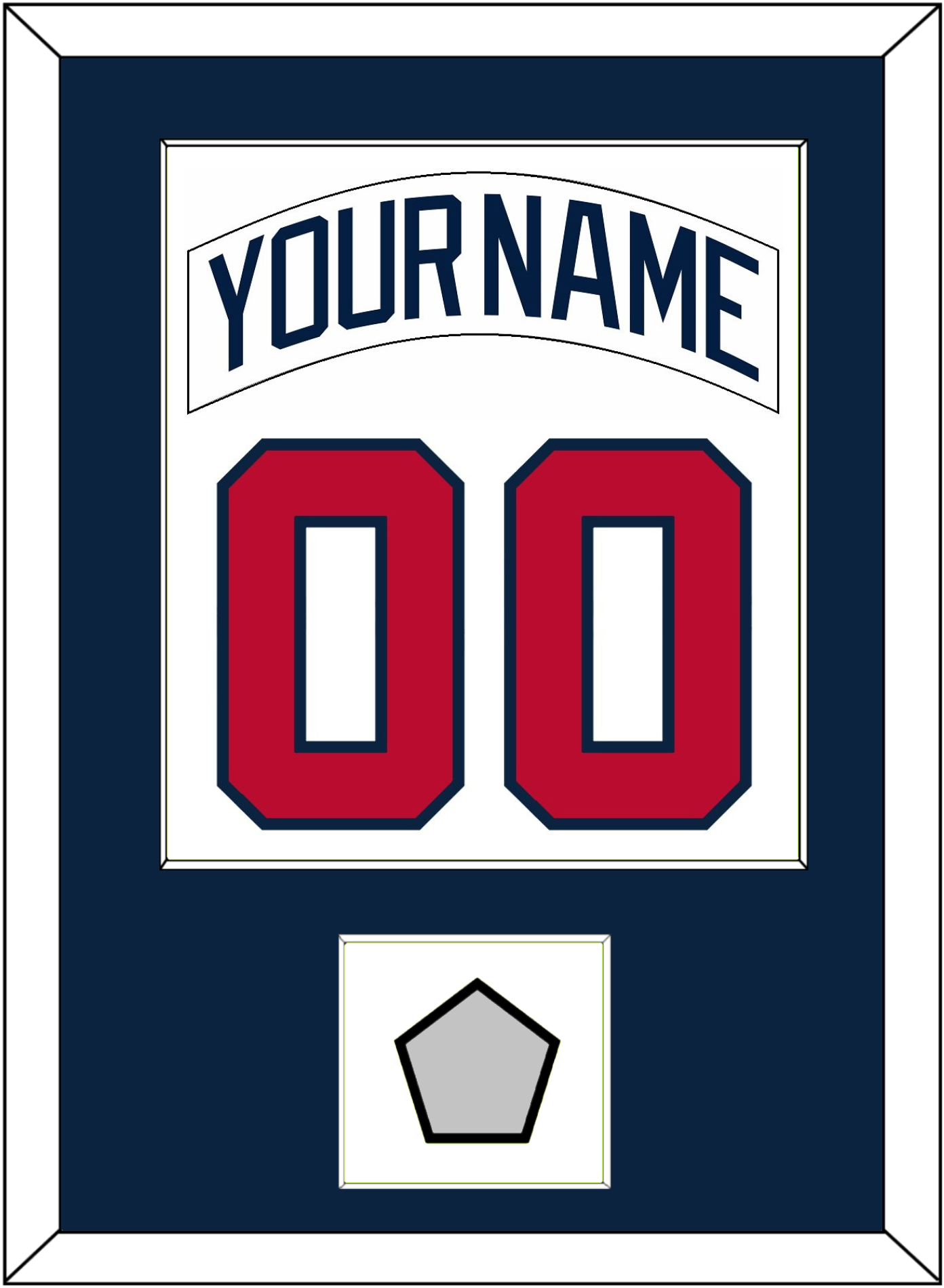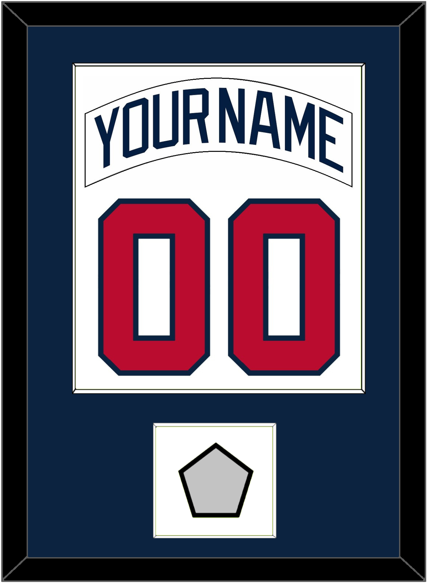 Atlanta Home White Jersey (1987 Through 2004) Nameplate & Number With 1995 World Series Patch. Single Mat Cut: Blue Mat With Blue Name, Red Number & Patch Mounted On White Mat. White Or Black Frame.