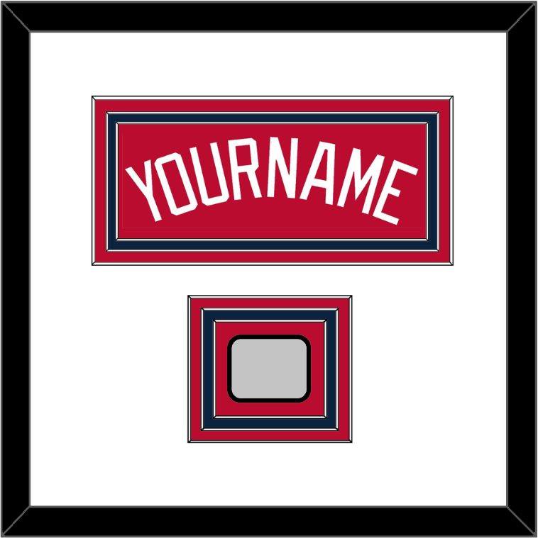Atlanta Alternate Home Red Jersey Name With 2021 World Series Jersey Patch. Triple Mat Cut: White Mat Over A Red Mat Over A Blue Mat. White Name & Patch Mounted On A Red Mat. Black Frame.