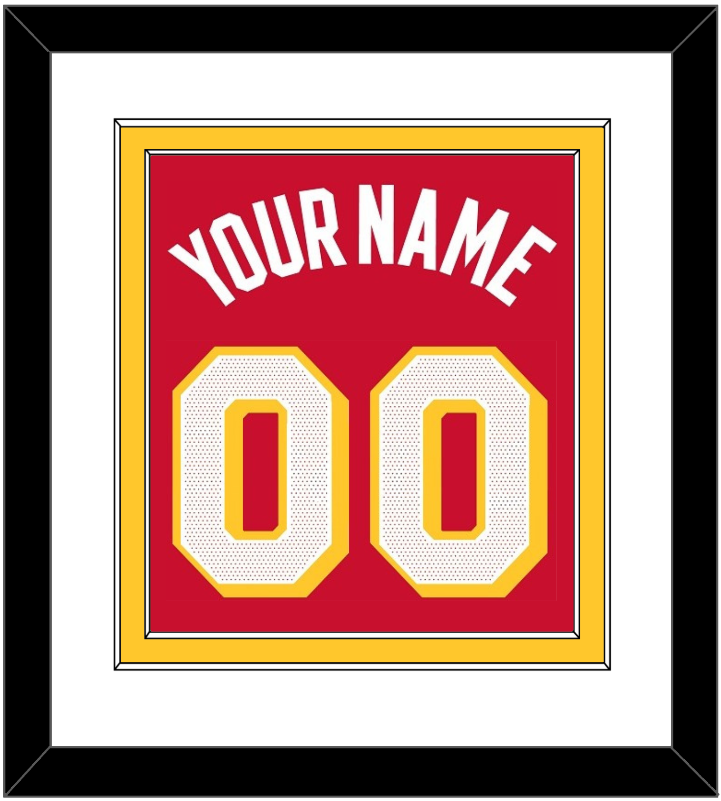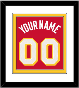 Atlanta Home Red Icon Jersey Name & Number. White Mat Over A Yellow Mat. White Name And Number Mounted On Red Mat. Black Frame.