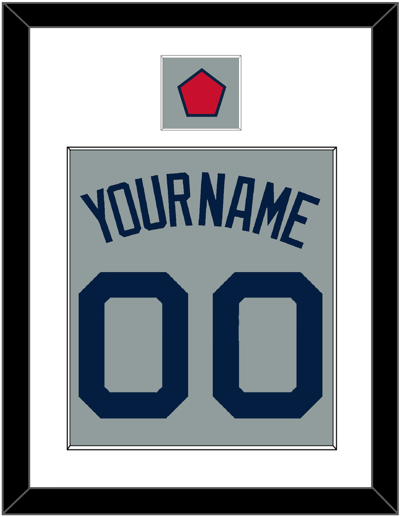 Boston Road Gray Jersey (2009 Through 2013) Name & Numbers With Sleeve Logo Patch.  Single Mat Cut:  White Mat With Blue Name, Number & Patch Mounted On A Gray Mat.  Black Frame.