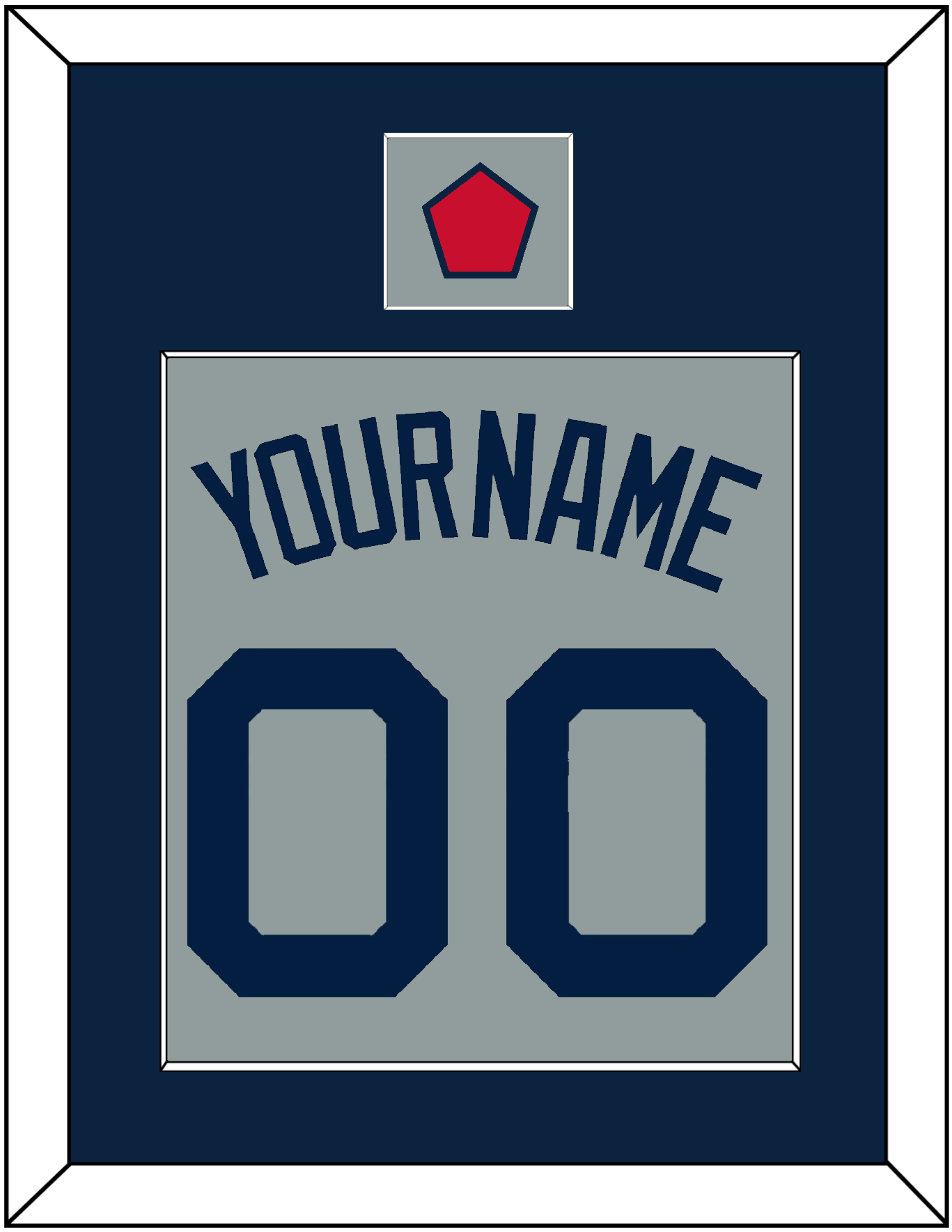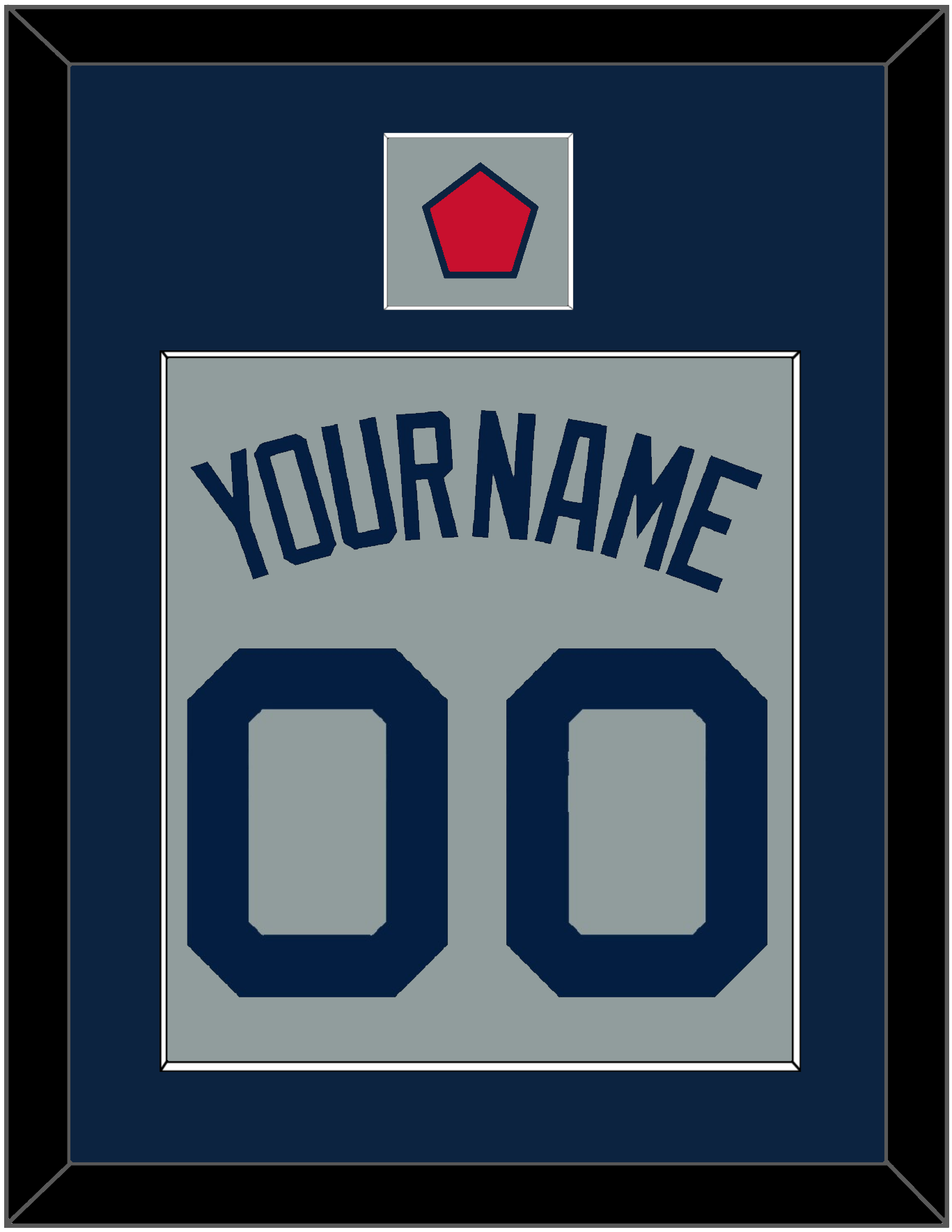 Boston Road Gray Jersey (2009 Through 2013) Name & Number With Sleeve Logo Patch.  Single Mat Cut:  Blue Mat With Blue Name, Number & Patch Mounted On A Gray Mat.  White Or Black Frame.