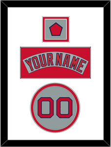 Boston Road Gray Jersey (1992 Through 2008) Nameplate & Number With Logo Sleeve Patch. Nameplate Is Single Mat Cut: White Mat With Gray Nameplate Mounted On A Red Mat. To Match The Jersey, Number And Patch Are Double Mat Cut: White Mat Over A Red Mat, Red Number & Patch Mounted On A Gray Mat. Black Frame.