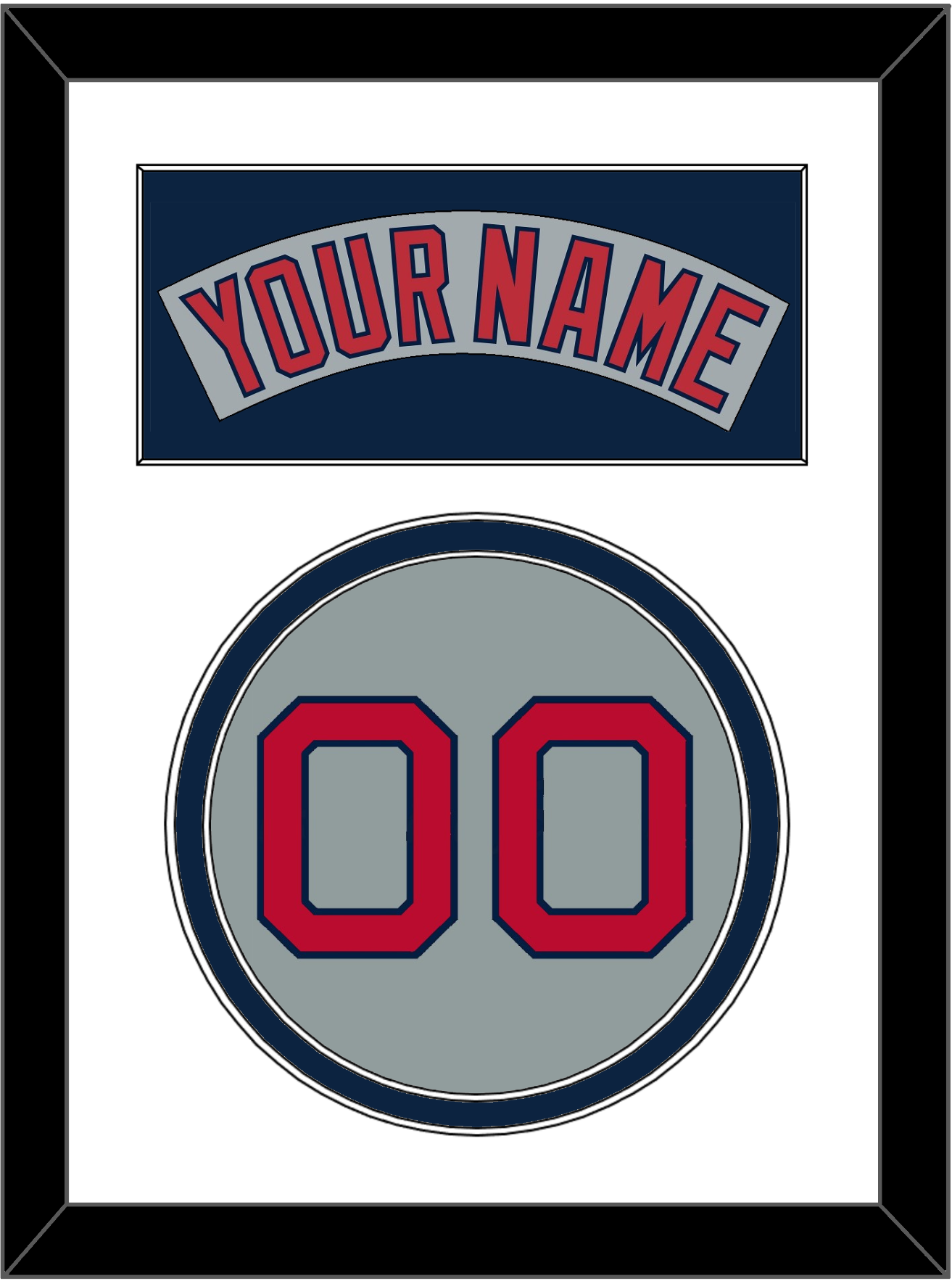Boston Road Gray Jersey (1992 Through 2008) Nameplate & Number. Nameplate Is Single Mat Cut: White Mat With Gray Nameplate Mounted On A Blue Mat. To Match The Jersey, Number Is Double Mat Cut: White Mat Over A Blue Mat, Red Number Mounted On A Gray Mat. Black Frame.