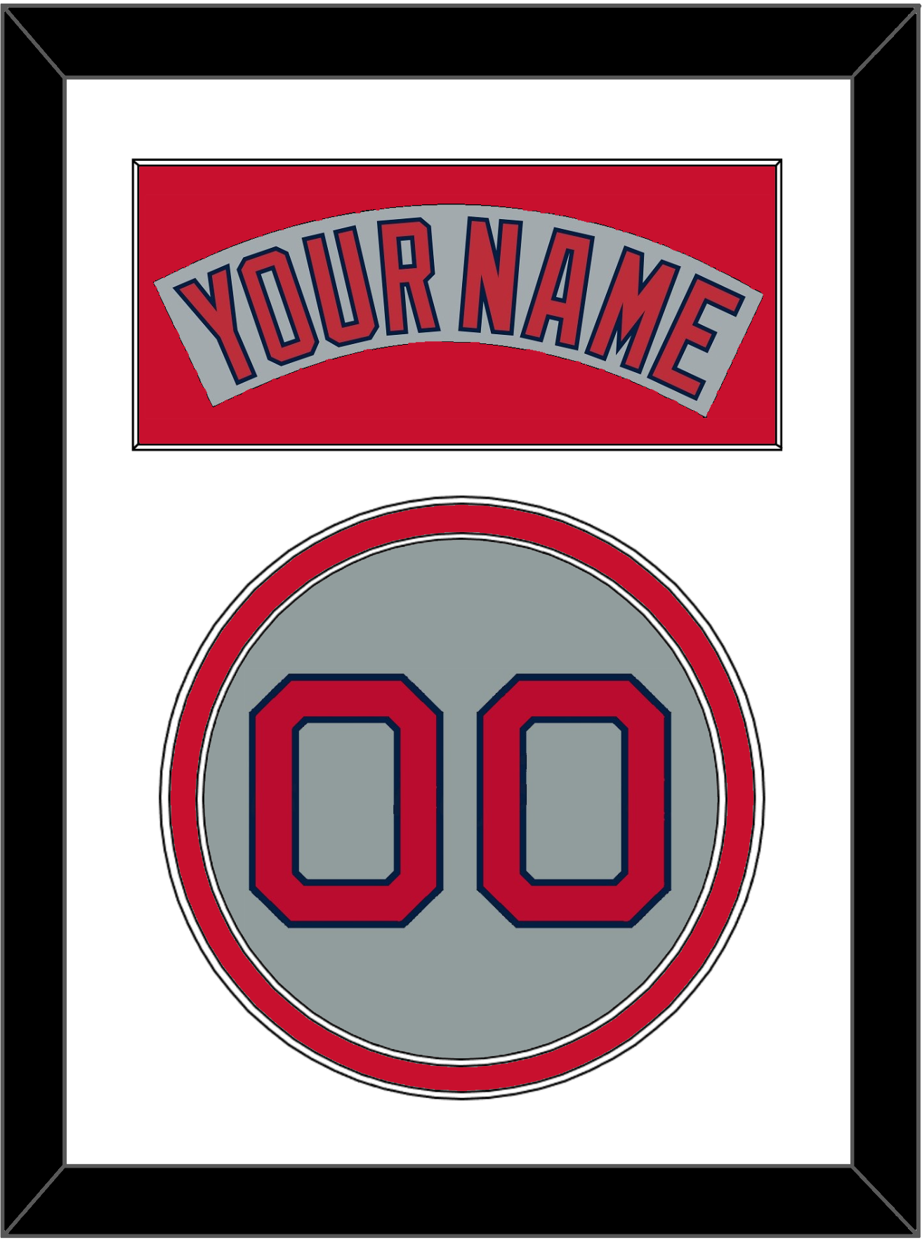Boston Road Gray Jersey (1992 Through 2008) Nameplate & Number. Nameplate Is Single Mat Cut: White Mat With Gray Nameplate Mounted On A Red Mat. To Match The Jersey, Number Is Double Mat Cut: White Mat Over A Red Mat, Red Number Mounted On A Gray Mat. Black Frame.