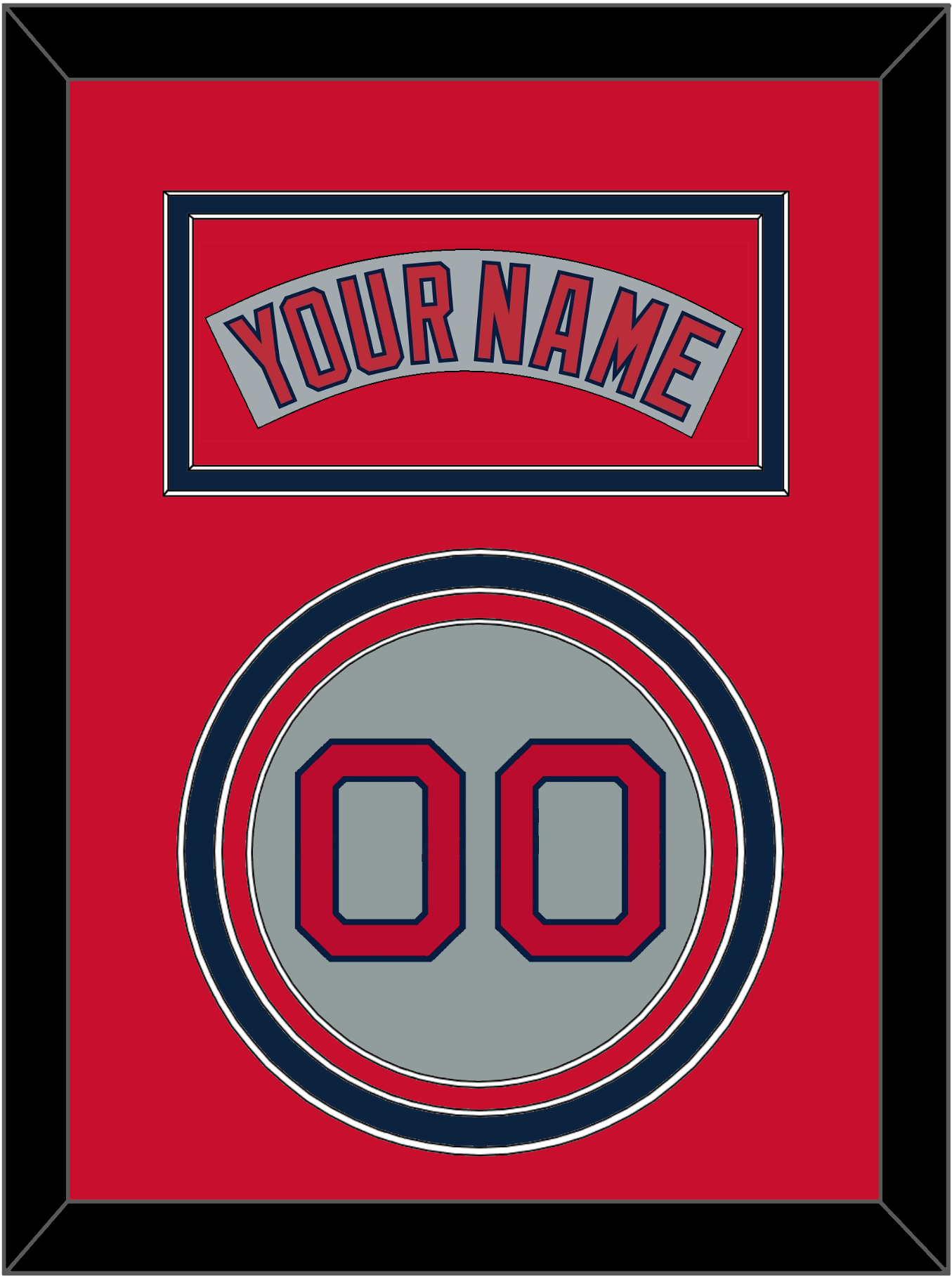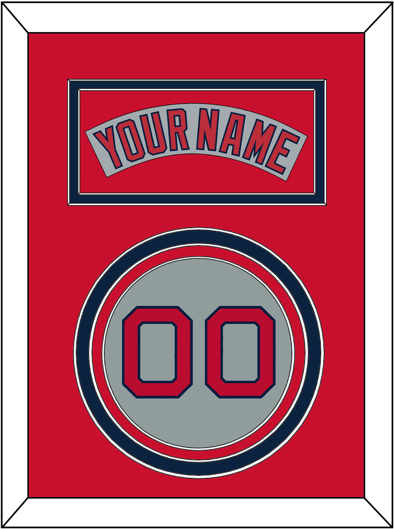 Boston Road Gray Jersey (1992 Through 2008) Nameplate & Number.  Nameplate Is Double Mat Cut:  Red Mat Over A Blue Mat.  Gray Nameplate Mounted On A Red Mat.  To Match The Jersey, Number Is Triple Mat Cut:  Red Mat Over A Blue Mat Over A Red Mat, Red Number Mounted On A Gray Mat.  White Or Black Frame.