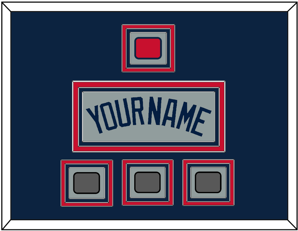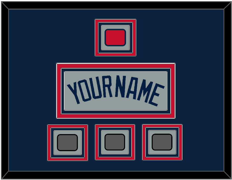 Boston Road Gray Jersey (2009 Through 2013) Name, Logo Patch From Sleeve And Three World Series Champions Patches (2004, 2007 & 2013, Or 2007, 2013 & 2018). Triple Mat Cut: Blue Mat Over A Red Mat Over A Blue Mat. Blue Name & Patches Mounted On A Gray Mat. White Or Black Frame.
