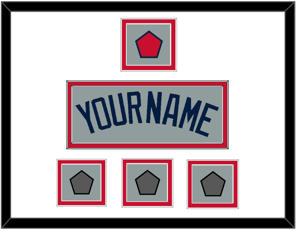 Boston Road Gray Jersey (2009 Through 2013) Name, Logo Patch From Sleeve And Three World Series Jersey Patches (2004, 2007 & 2013, Or 2007, 2013 & 2018). Double Mat Cut: White Mat Over A Red Mat. Blue Name & Patches Mounted On A Gray Mat. Black Frame.