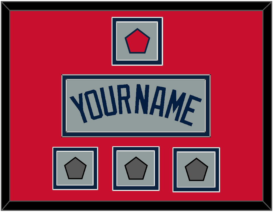 Boston Road Gray Jersey (2009 Through 2013) Name, Logo Patch From Sleeve And Three World Series Jersey Patches (2004, 2007 & 2013, Or 2007, 2013 & 2018). Double Mat Cut: Red Mat Over A Blue Mat. Blue Name & Patches Mounted On A Gray Mat. White Or Black Frame.