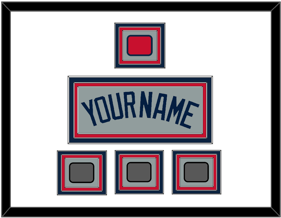 Boston Road Gray Jersey (2009 Through 2013) Name, Logo Patch From Sleeve And Three World Series Jersey Patches (2004, 2007 & 2013, Or 2007, 2013 & 2018). Triple Mat Cut: White Mat Over A Blue Mat Over A Red Mat. Blue Name & Patches Mounted On A Gray Mat. Black Frame.