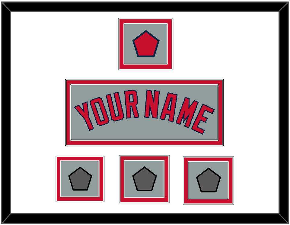 Boston Road Gray Jersey Name, Logo Patch From Sleeve And Three World Series Jersey Patches (2004, 2007 & 2013, Or 2007, 2013 & 2018). Double Mat Cut: White Mat Over A Red Mat. Red Name & Patches Mounted On A Gray Mat. Black Frame.