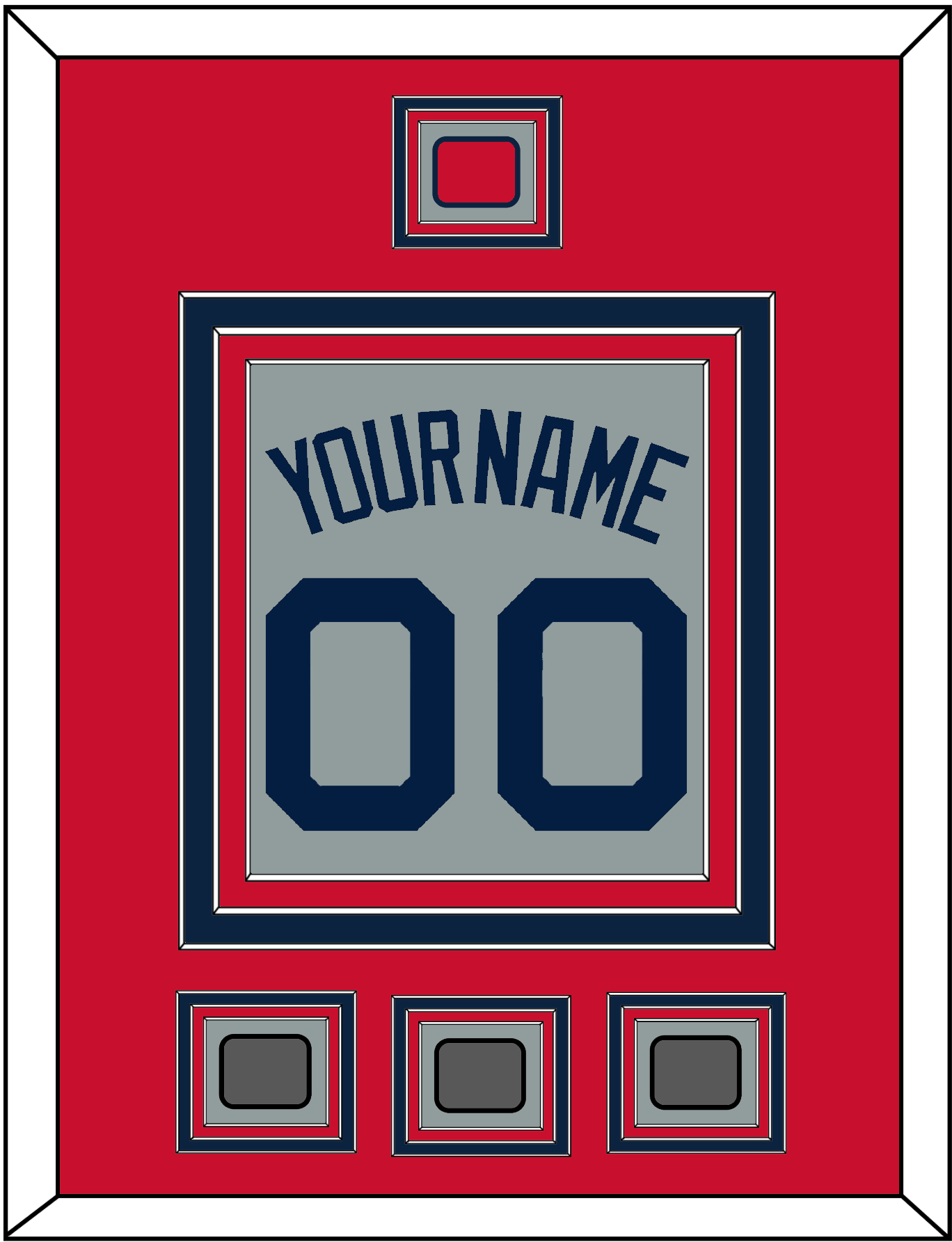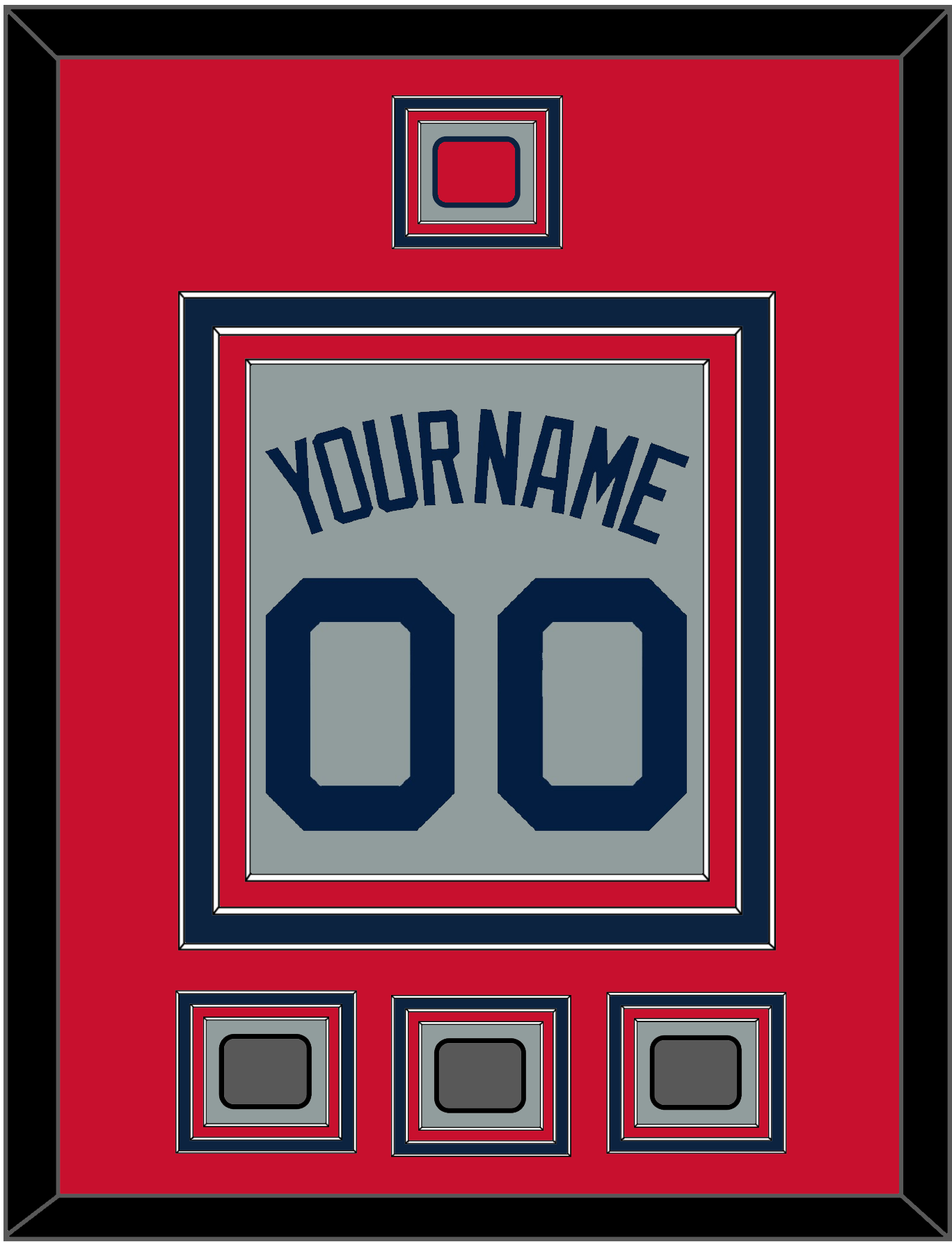Boston Road Gray Jersey (2009 Through 2013) Name, Number, Logo Patch From Sleeve And Three World Series Champions Patches (2004, 2007 & 2013 Or 2007, 2013 & 2018). Triple Mat Cut: Red Mat Over A Blue Mat Over A Red Mat. Blue Name, Number & Patches Mounted On A Gray Mat. White Or Black Frame.