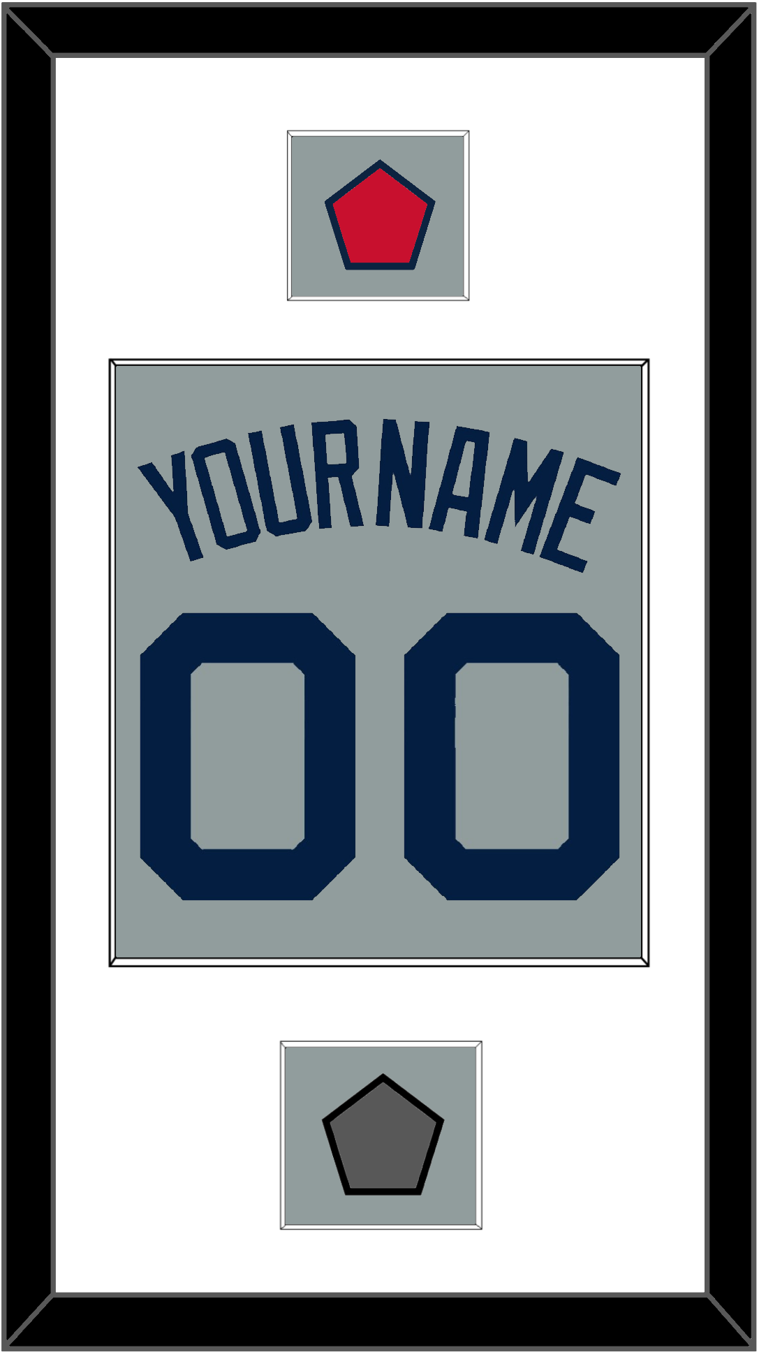 Boston Road Gray Jersey (2009 Through 2013) Name, Number, Logo Patch From Sleeve And World Series Jersey Patch (2004, 2007, 2013 Or 2018).  Single Mat Cut:  White Mat With Blue Name, Number & Patches Mounted On A Gray Mat.  Black Frame.
