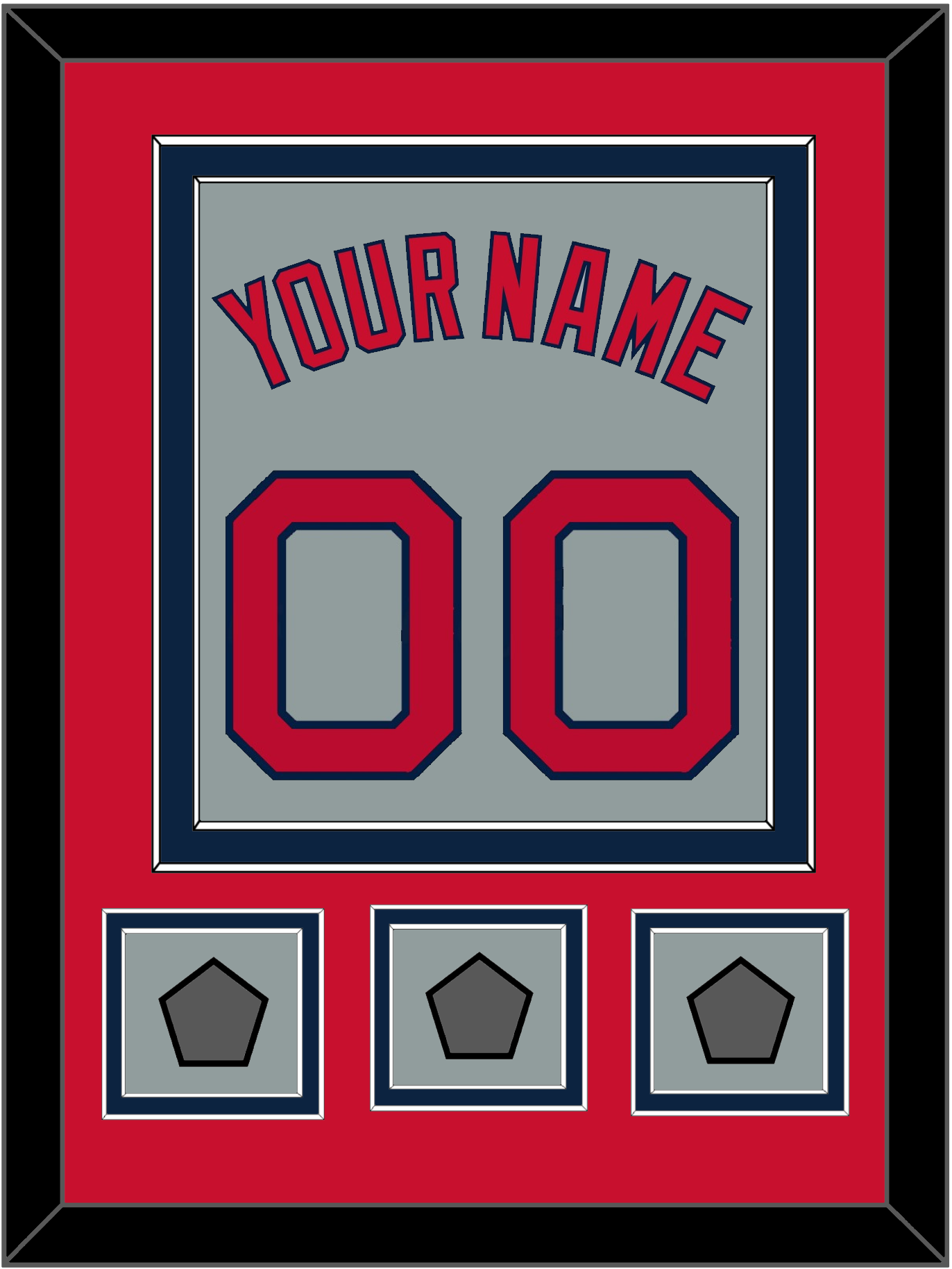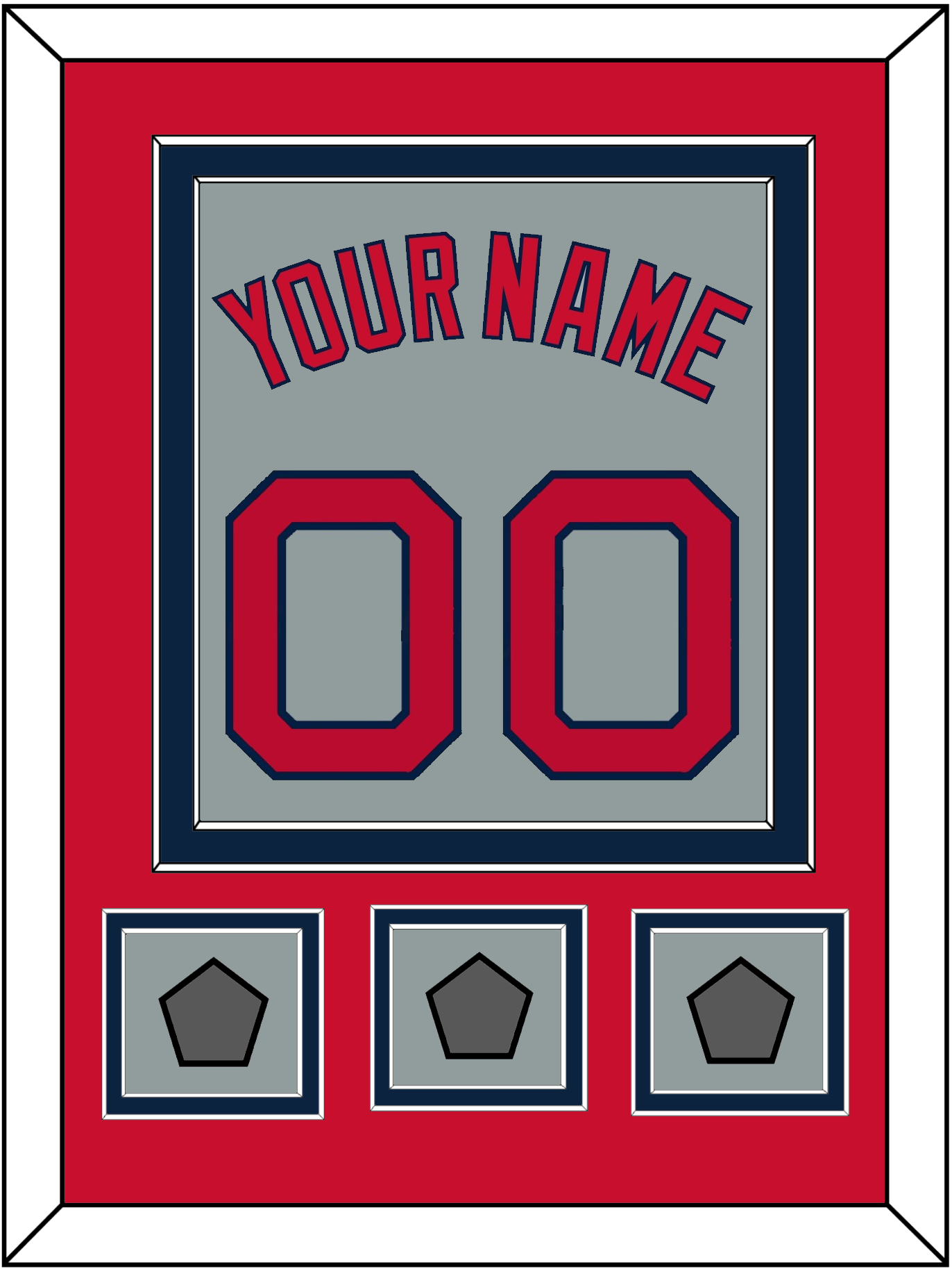 Boston Road Gray Jersey Name & Number With 3 (2004, 2007 & 2013 Or 2007, 2013 & 2018) World Series Champions Patches. Double Mat Cut: Red Mat Over A Blue Mat. Red Name, Number & Patches Mounted On A Gray Mat. White Or Black Frame.