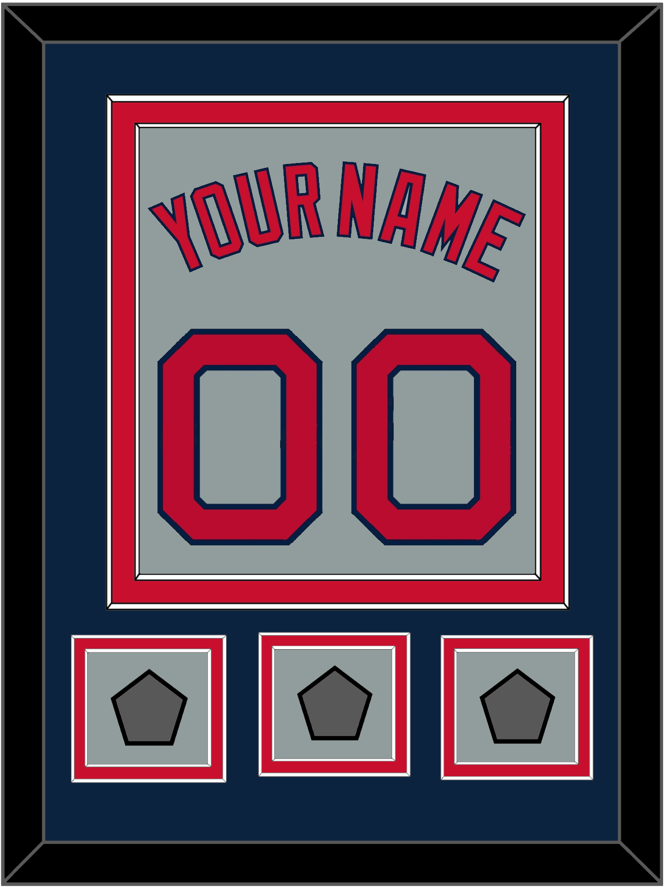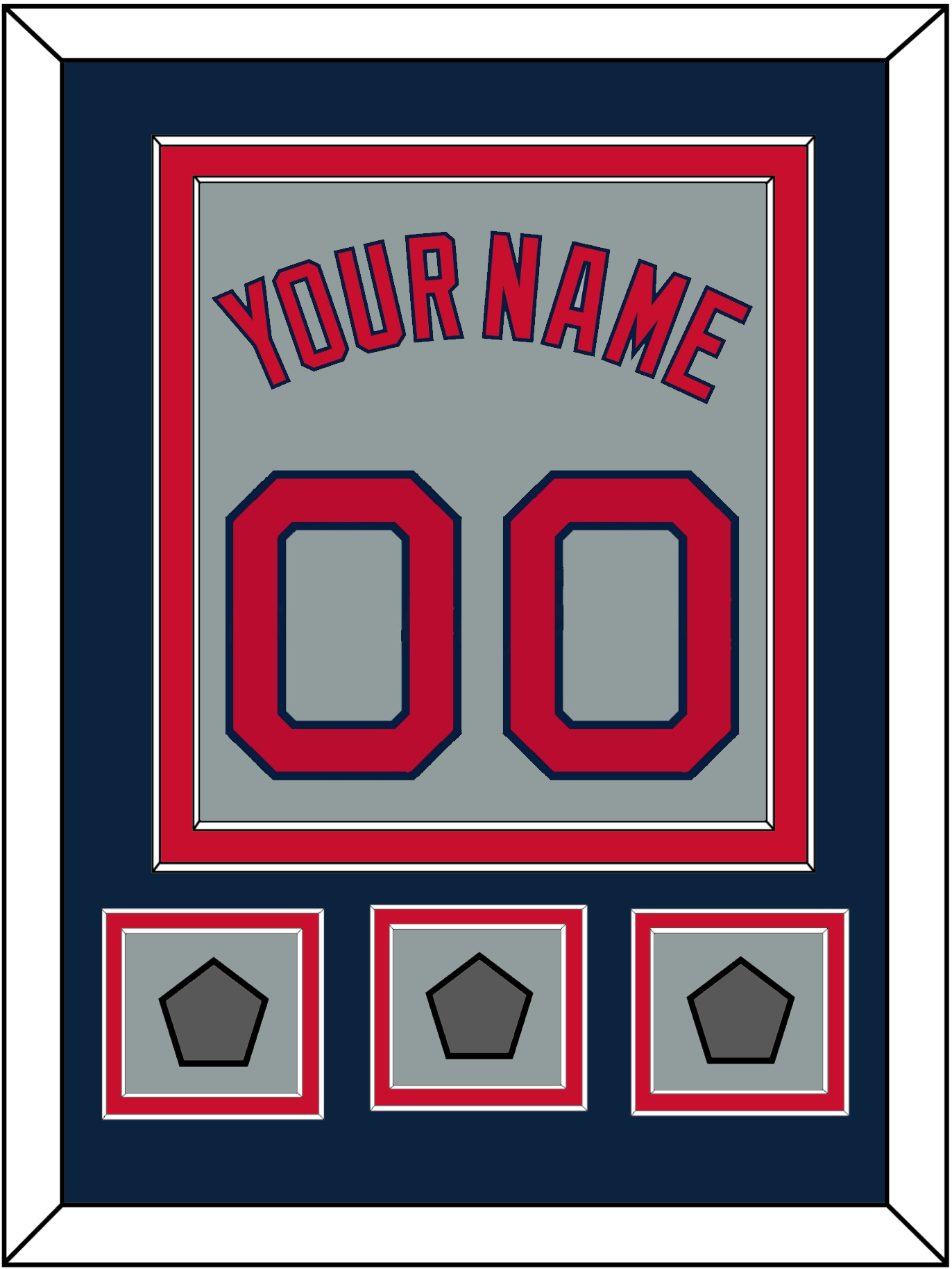 Boston Road Gray Jersey Name & Number With 3 (2004, 2007 & 2013 Or 2007, 2013 & 2018) World Series Champions Patches. Double Mat Cut: Blue Mat Over A Red Mat. Red Name, Number & Patches Mounted On A Gray Mat. White Or Black Frame.