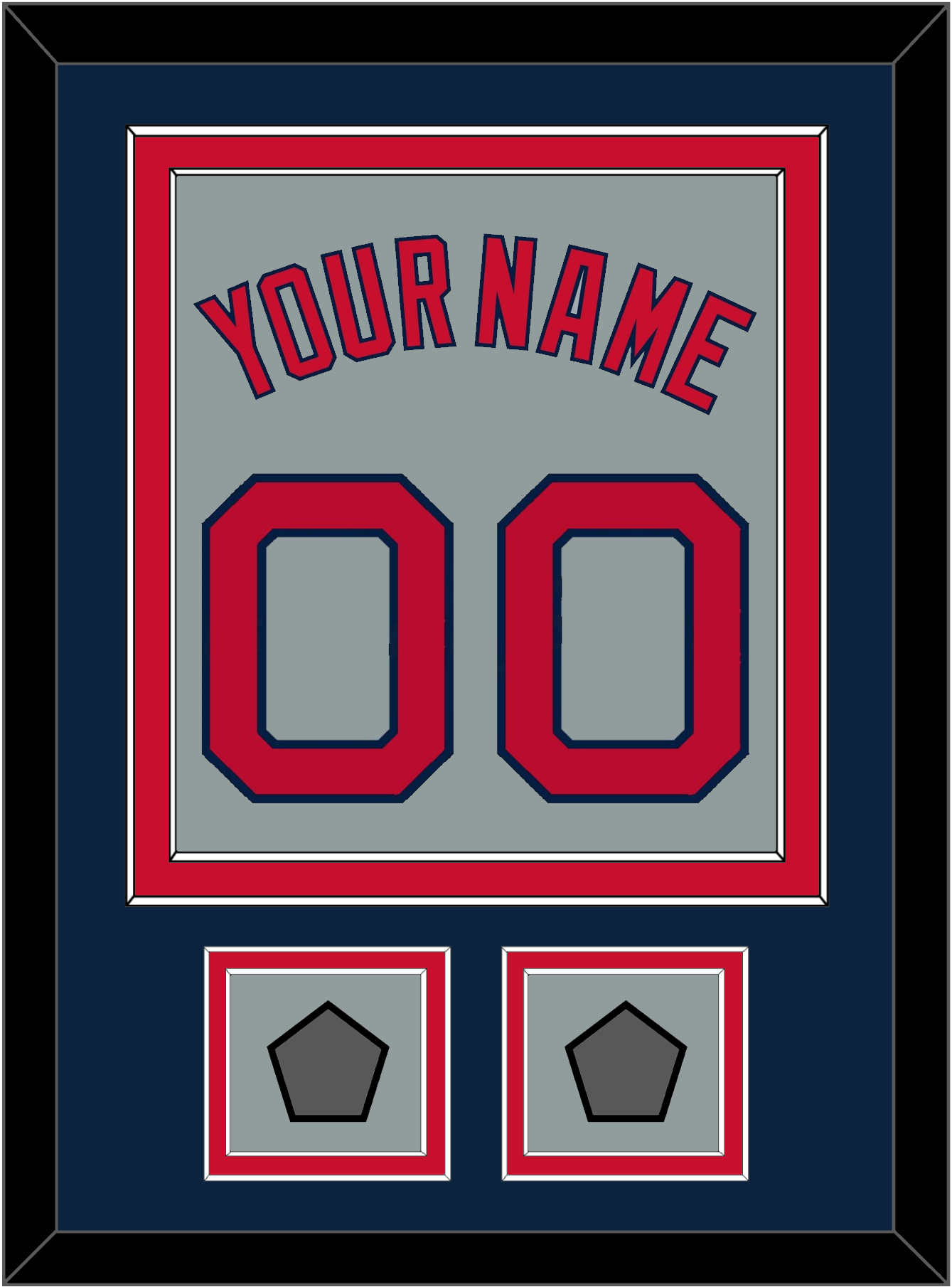 Boston Road Gray Jersey Name & Number With 2004 & 2007, 2007 & 2013 Or 2013 & 2018 World Series Champions Patches. Double Mat Cut: Blue Mat Over A Red Mat. Red Name, Number & Patches Mounted On A Gray Mat. White Or Black Frame.