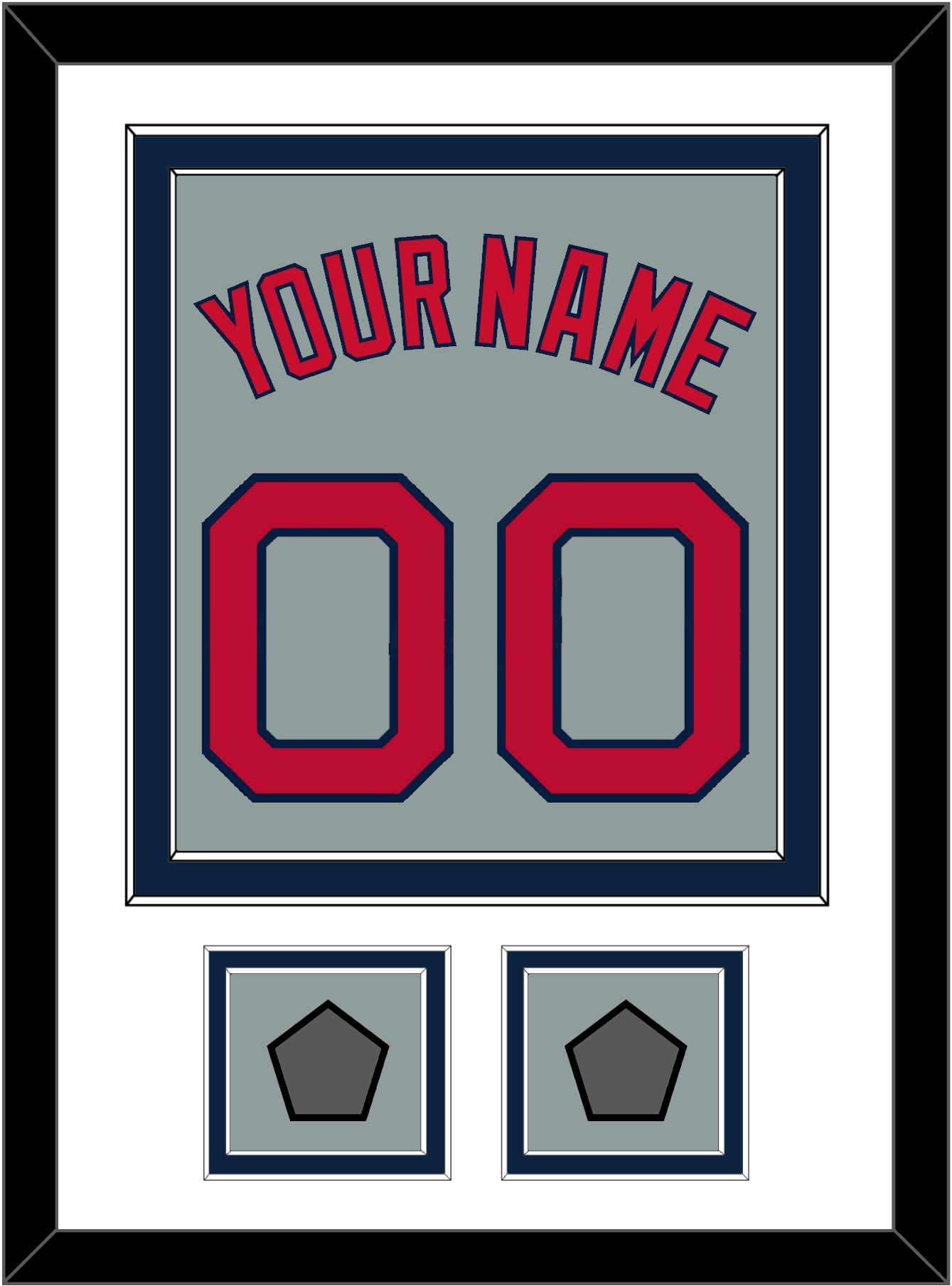 Boston Road Gray Jersey Name & Number With 2004 & 2007, 2007 & 2013 Or 2013 & 2018 World Series Jersey Patches. Double Mat Cut: White Mat Over A Blue Mat. Red Name, Number & Patches Mounted On A Gray Mat. Black Frame.