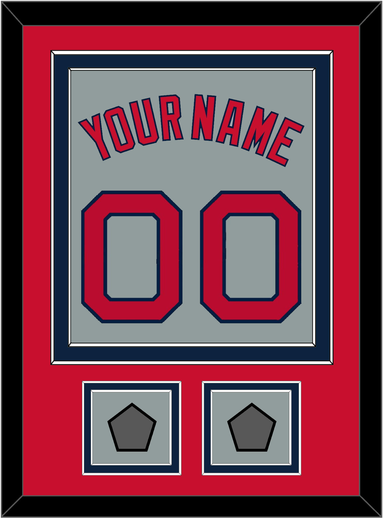 Boston Road Gray Jersey Name & Number With 2004 & 2007, 2007 & 2013 Or 2013 & 2018 World Series Jersey Patches. Double Mat Cut: Red Mat Over A Blue Mat. Red Name, Number & Patches Mounted On A Gray Mat. White Or Black Frame.