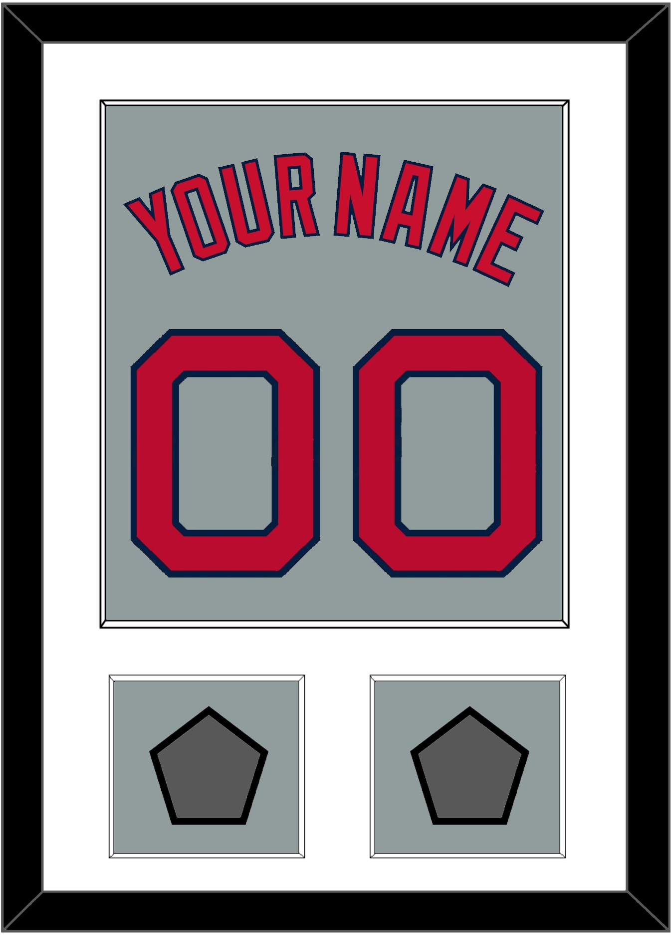 Boston Road Gray Jersey Name & Number With 2004 & 2007, 2007 & 2013 Or 2013 & 2018 World Series Jersey Patches. Single Mat Cut: White Mat With Red Name, Number & Patch Mounted On A Gray Mat. Black Frame.