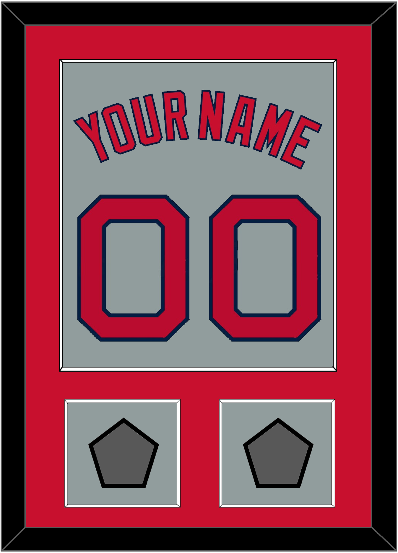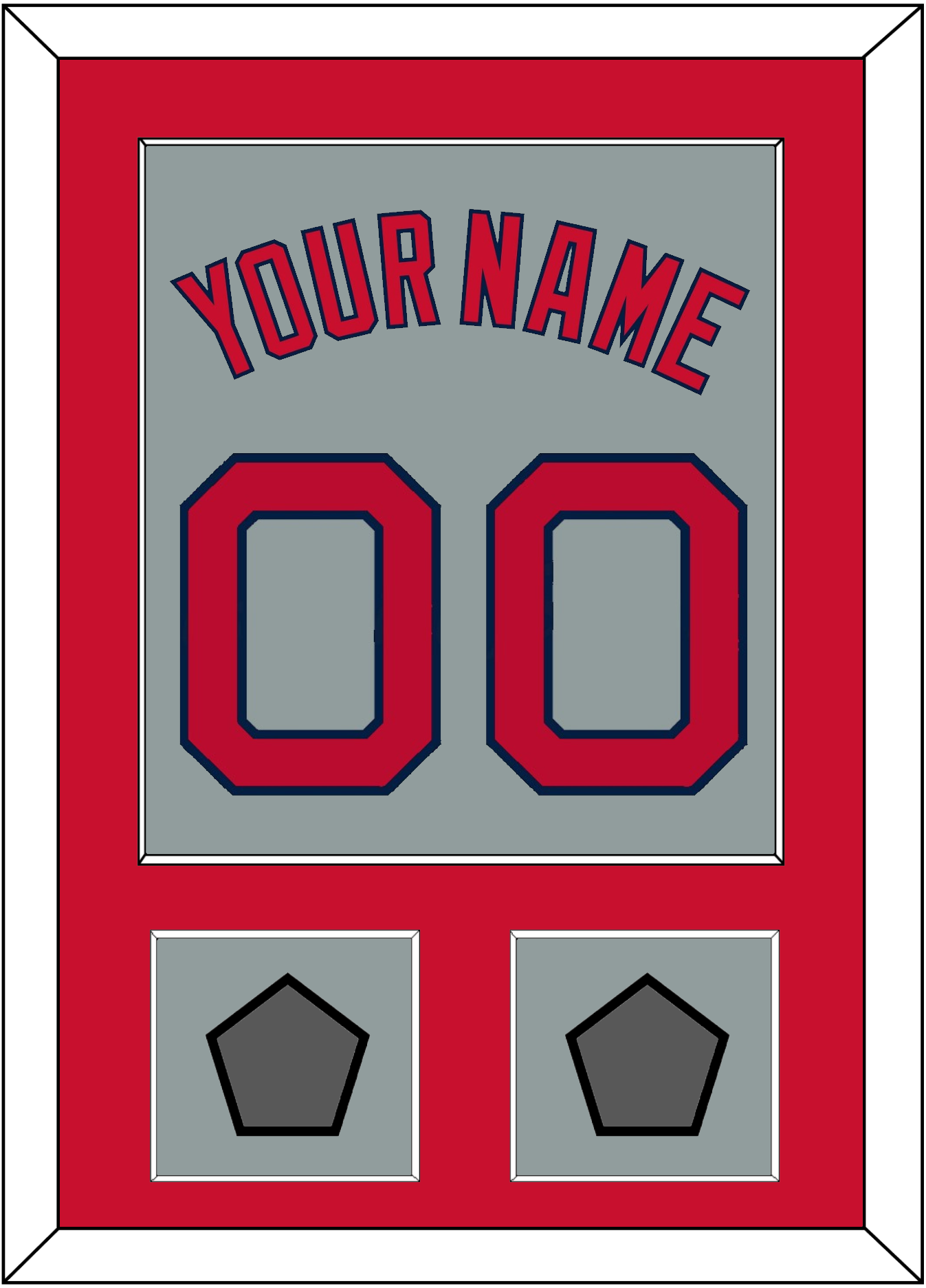Boston Road Gray Jersey Name & Number With 2004 & 2007, 2007 & 2013 Or 2013 & 2018 World Series Jersey Patches. Single Mat Cut: Red Mat With Red Name, Number & Patch Mounted On A Gray Mat. White Or Black Frame.