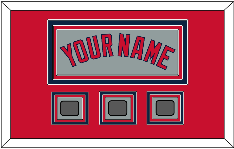 Boston Road Gray Jersey Name With Three World Series Champions Patches (2004, 2007 & 2013 Or 2007, 2013 & 2018). Triple Mat Cut: Red Mat Over A Blue Mat Over A Red Mat. Red Name & Patches Mounted On A Gray Mat. White Or Black Frame.