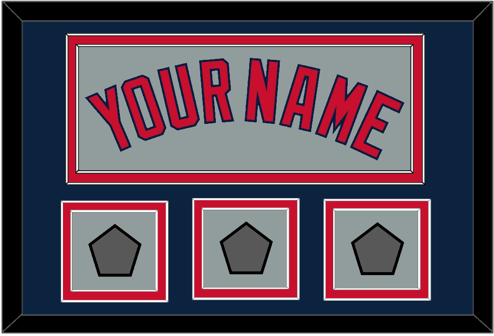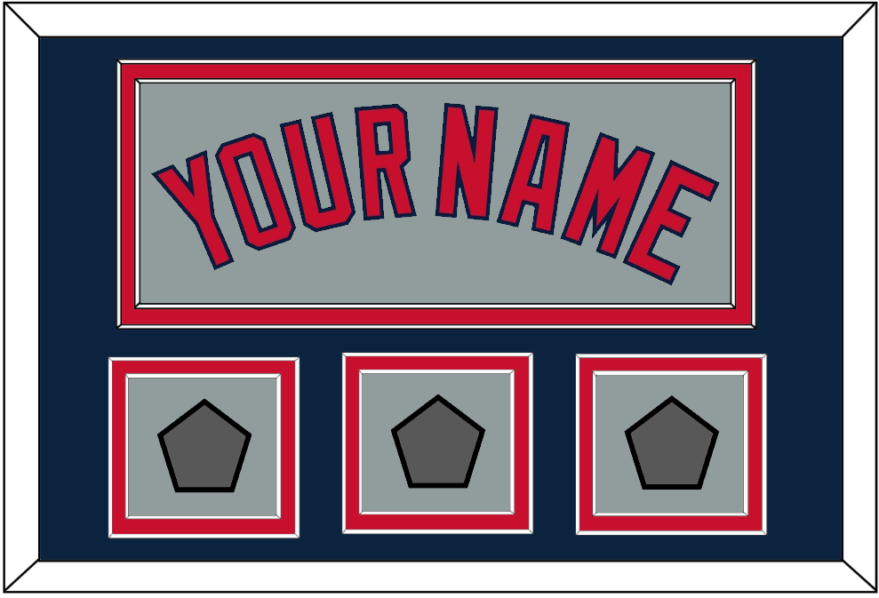 Boston Road Gray Jersey Name With Three World Series Jersey Patches (2004, 2007 & 2013 Or 2007, 2013 & 2018). Double Mat Cut: Blue Mat Over A Red Mat. Red Name & Patches Mounted On A Gray Mat. White Or Black Frame.