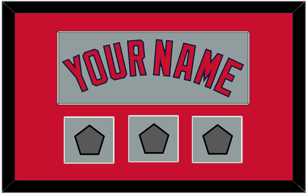 Boston Road Gray Jersey Name With Three World Series Jersey Patches (2004, 2007 & 2013 Or 2007, 2013 & 2018). Single Mat Cut: Red Mat With Red Name & Patches Mounted On A Gray Mat. White Or Black Frame.