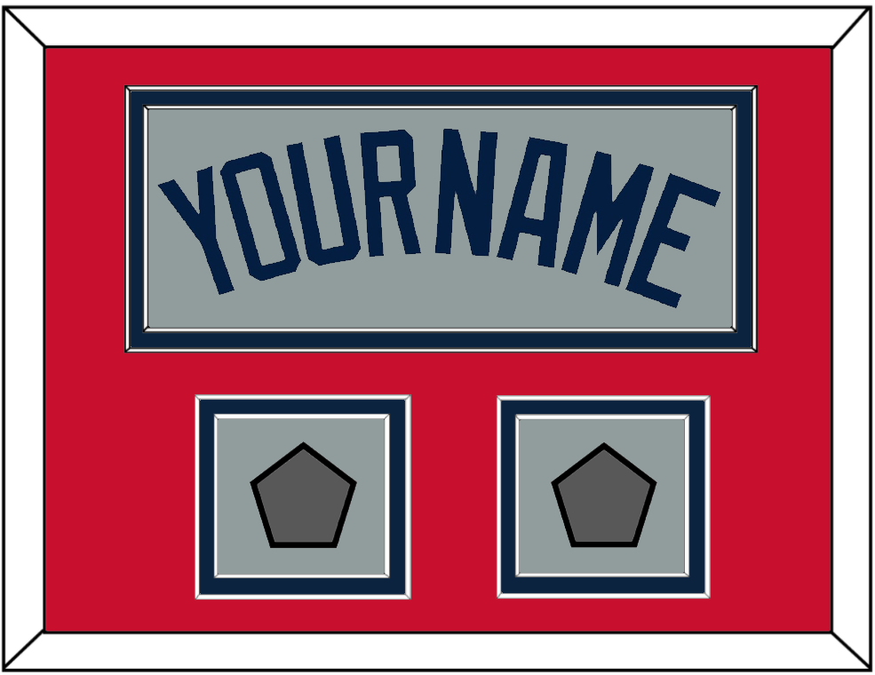 Boston Road Gray Jersey (2009 Through 2013) Name With Two World Series Champions Patches (2004 & 2007, 2007 & 2013 Or 2013 & 2018). Double Mat Cut: Red Mat Over A Blue Mat. Blue Name & Patches Mounted On A Gray Mat. White Or Black Frame.