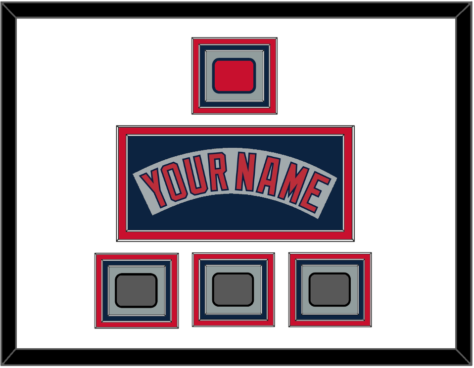 Boston Road Gray Jersey (1992 Through 2008) Nameplate With Logo Patch From Sleeve & Three World Series Champions Patches (2004, 2007 & 2013, Or 2007, 2013 & 2018). Nameplate Is Double Mat Cut: White Mat Over A Red Mat. Nameplate Mounted On A Blue Mat. To Match The Jersey, The Patches Are Triple Mat Cut: White Mat Over A Red Mat Over A Blue Mat. Patches Mounted On A Gray Mat. Black Frame.