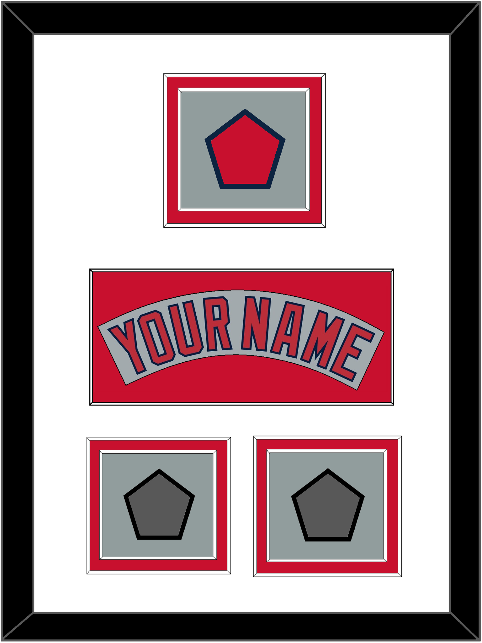 Boston Road Gray Jersey (1992 Through 2008) Nameplate With Logo Patch From Sleeve & Two World Series Jersey Patches (2004 & 2007, 2007 & 2013, Or 2013 & 2018). Nameplate Is Single Mat Cut: White Mat With Nameplate Mounted On A Red Mat. To Match The Jersey, The Patches Are Double Mat Cut: White Mat Over A Red Mat With Patches Mounted On A Gray Mat. Black Frame.