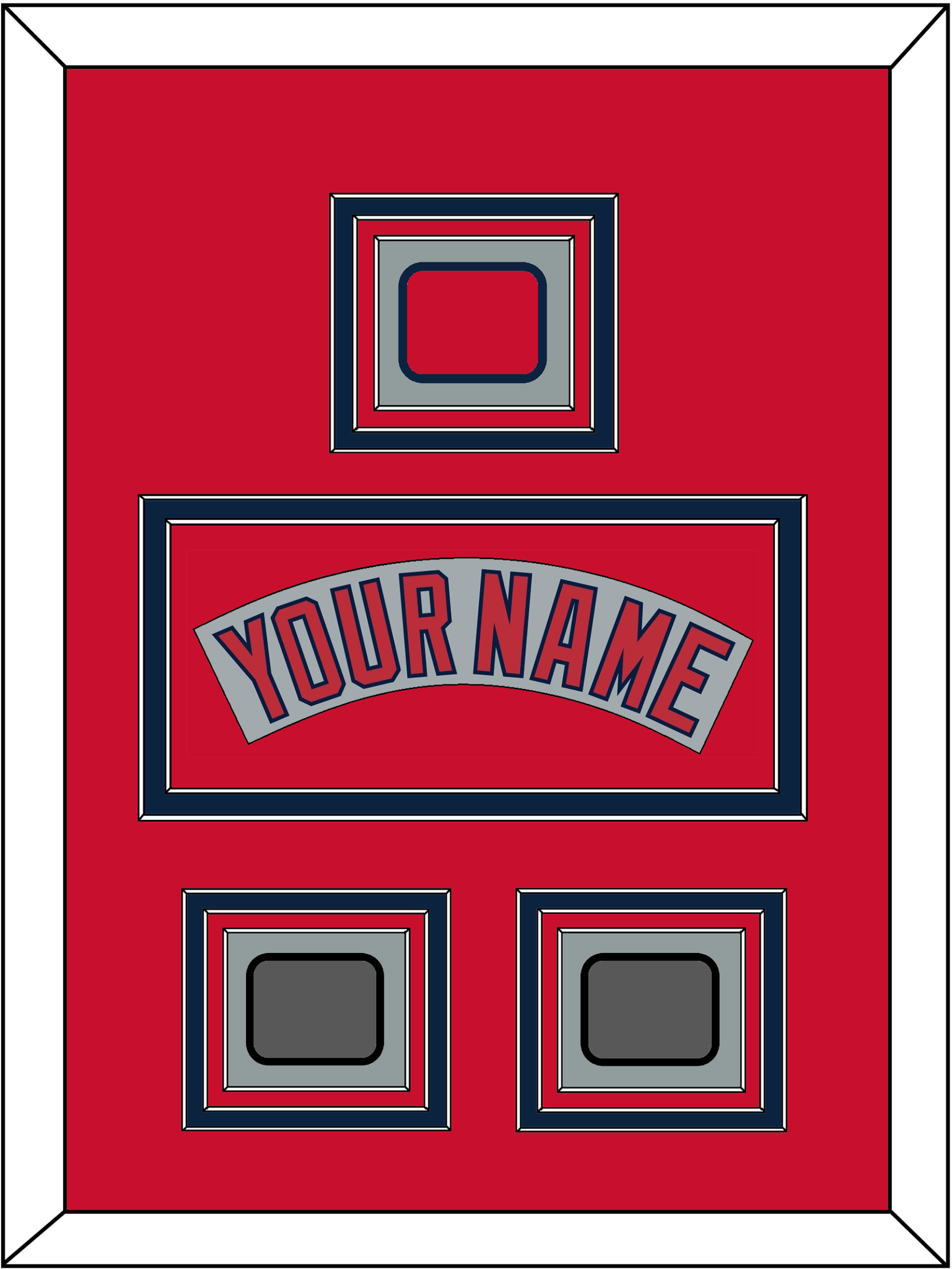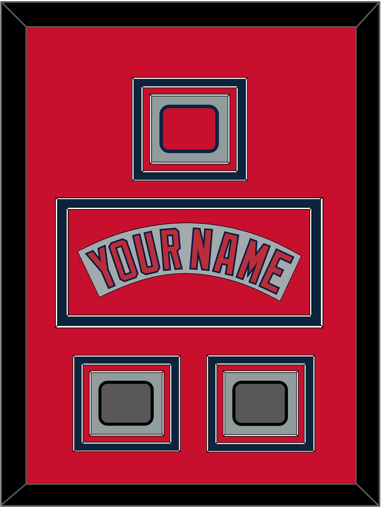 Boston Road Gray Jersey (1992 Through 2008) Nameplate With Logo Patch From Sleeve & Two World Series Jersey Patches (2004 & 2007, 2007 & 2013, Or 2013 & 2018). Nameplate Is Double Mat Cut: Red Mat Over A Blue Mat. Nameplate Mounted On A Red Mat. To Match The Jersey, The Patches Are Triple Mat Cut: Red Mat Over A Blue Mat Over A Red Mat. Patches Mounted On A Gray Mat. White Or Black Frame.