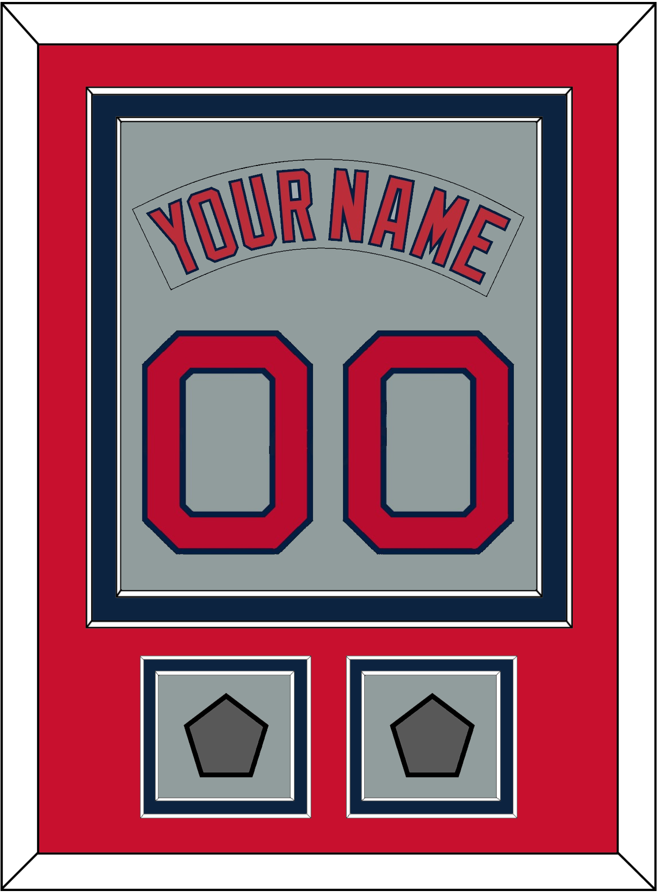 Boston Road Gray Jersey (1992 Through 2008) Nameplate & Number (From The Back Of The Jersey) With World Series Champions Patches; 2004 & 2007, 2007 & 2013, Or 2013 & 2018. Double Mat Cut: Red Mat Over A Blue Mat. Gray Nameplate, Red Number & Patches Mounted On A Gray Mat. White Or Black Frame.