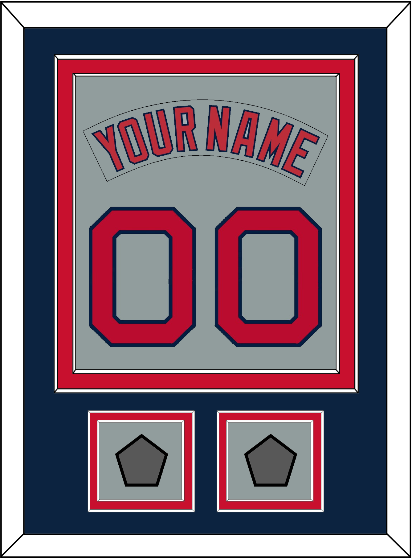 Boston Road Gray Jersey (1992 Through 2008) Nameplate & Number (From The Back Of The Jersey) With World Series Champions Patches; 2004 & 2007, 2007 & 2013, Or 2013 & 2018. Double Mat Cut: Blue Mat Over A Red Mat. Gray Nameplate, Red Number & Patches Mounted On A Gray Mat. White Or Black Frame.