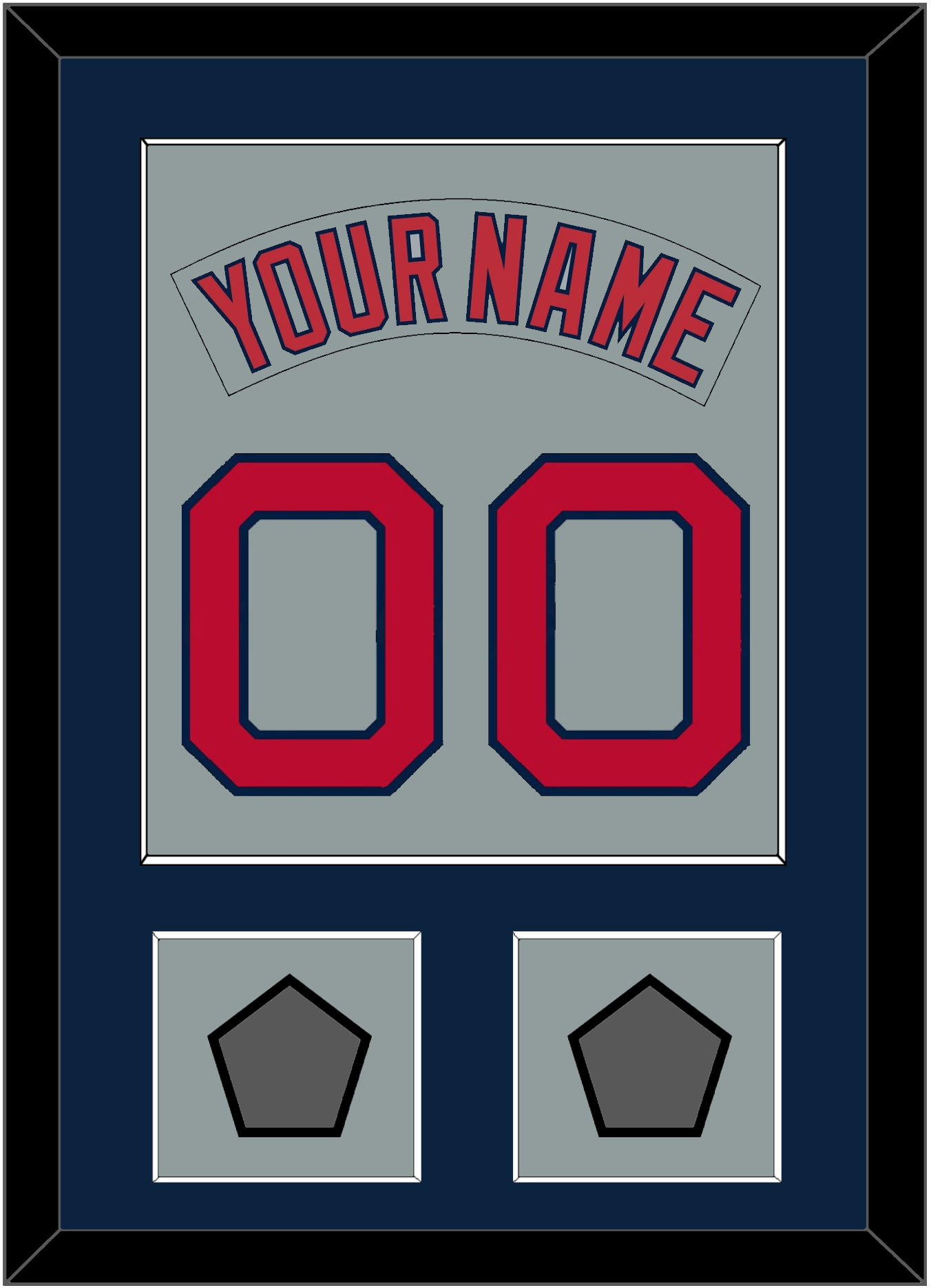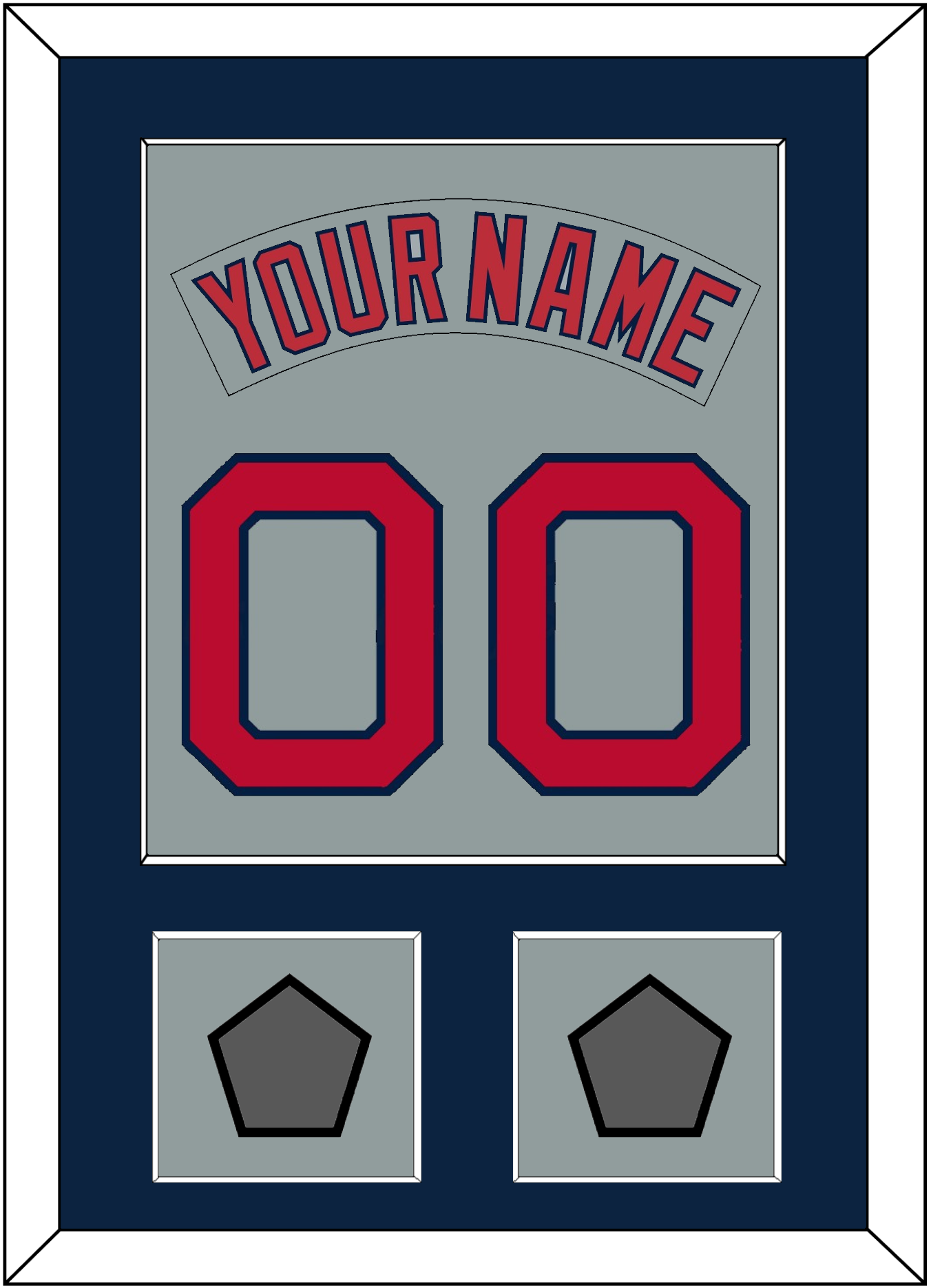 Boston Road Gray Jersey (1992 Through 2008) Nameplate & Number (From The Back Of The Jersey) With World Series Champions Patches; 2004 & 2007, 2007 & 2013, Or 2013 & 2018. Single Mat Cut: Blue Mat With Gray Nameplate, Red Number & Patches Mounted On A Gray Mat. White Or Black Frame.