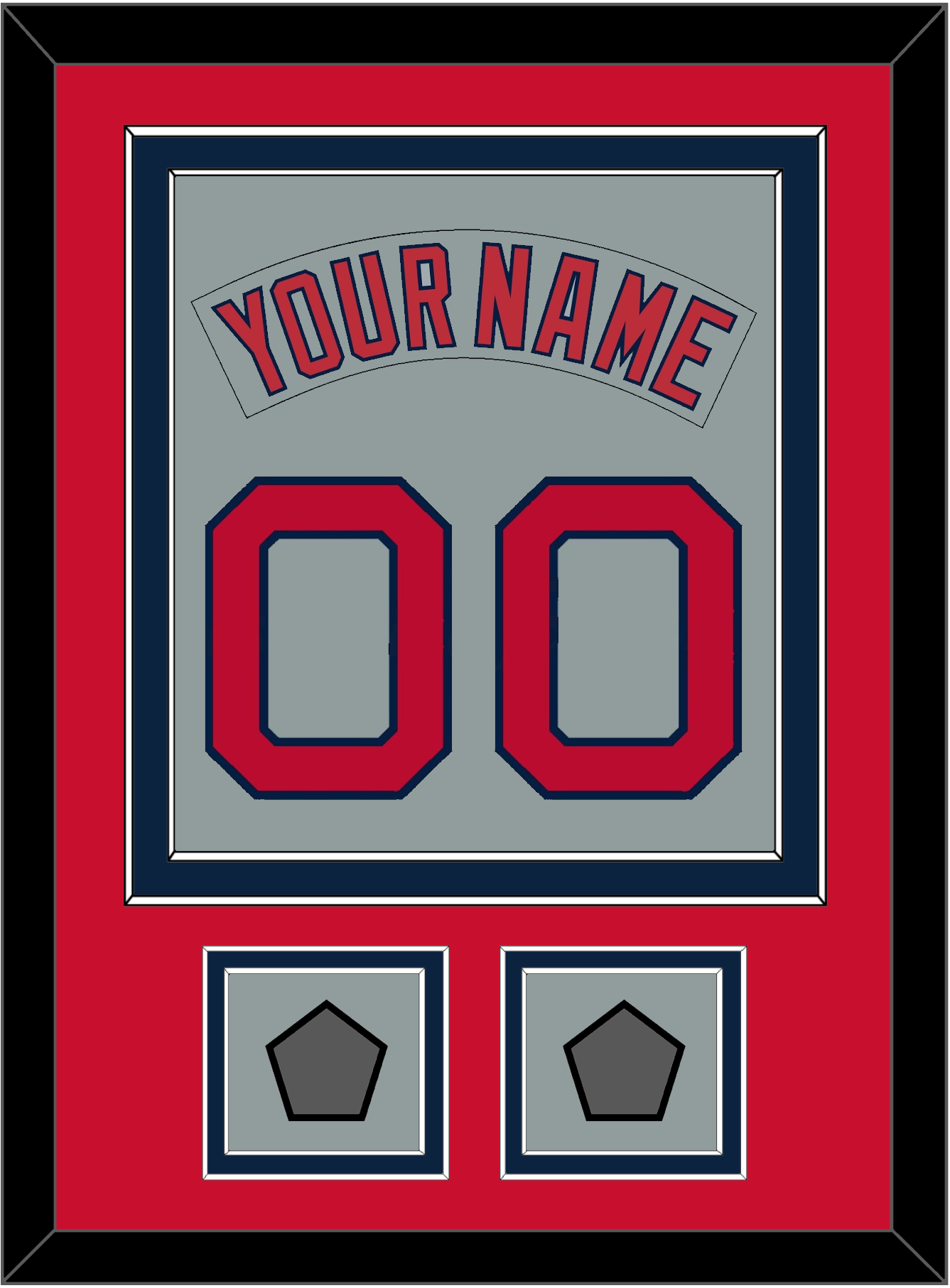 Boston Road Gray Jersey (1992 Through 2008) Nameplate & Number (From The Back Of The Jersey) With World Series Jersey Patches; 2004 & 2007, 2007 & 2013, Or 2013 & 2018. Double Mat Cut: Red Mat Over A Blue Mat. Gray Nameplate, Red Number & Patches Mounted On A Gray Mat. White Or Black Frame.